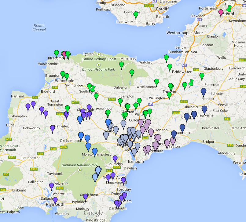 This map is scaleable you can zoom in and out and click on any point for more information. This is a screenshot showing possible groupings in Devon. [This map is not scaleable here] Some points refer to DNA results and others are chosen to reflect connections with the historical record. They are subject to change.