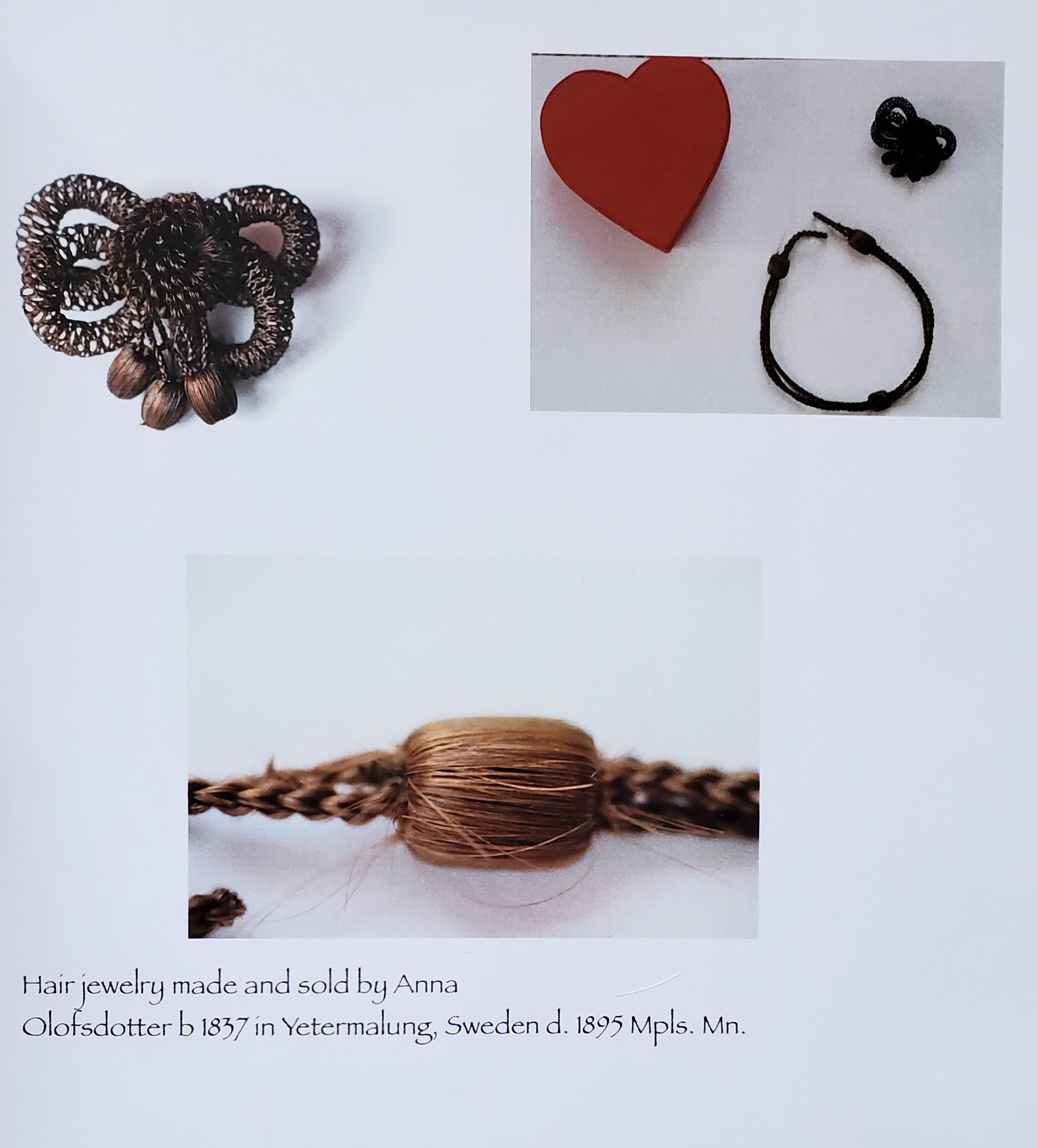 My mother had misattributed the hair jewelry to the wrong paternal great-grandmother! The jewelry was crafted by Anna Olofsdotter born in Bjuråker, Dalarna, Sweden 13 February 1837 who came to America in 1880 with her husband Johan Soloman Lundberg and her six surviving children. They settled in Minneapolis where she died 11 March 1895. It was passed to her son Carl Johan Lundberg and to his son Roy Sidney Lundberg and then to my mother and then to me.