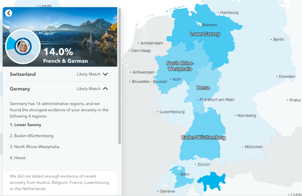 We often compare the results of different atDNA (autosomal DNA) tests with regards to Ancestral Origins. Usually I share breakdowns via the five companies I have tested with. I wanted for the purposes of this post to limit my comparison to one particular geographical area. This came to mind when recently reviewing an update of my Ancestral Origins for my Living DNA results. Overall I find Living DNA to be among the least accurate and the most confounding. However when I honed in on my “Germanic” Origins, I found Living DNA to be quite accurate in terms of geographic specificity and its alignment with the origins of my Germanic families, which includes German, Dutch, Swiss and Austrian. I do not mean that as a blanket endorsement of Living DNA but it may point out that different companies may more accurately or inaccurately portray one’s Ancestral Origins in very specific areas. This is both an issue of geography and of percentages attributed to various regions. So first my results from Living DNA: