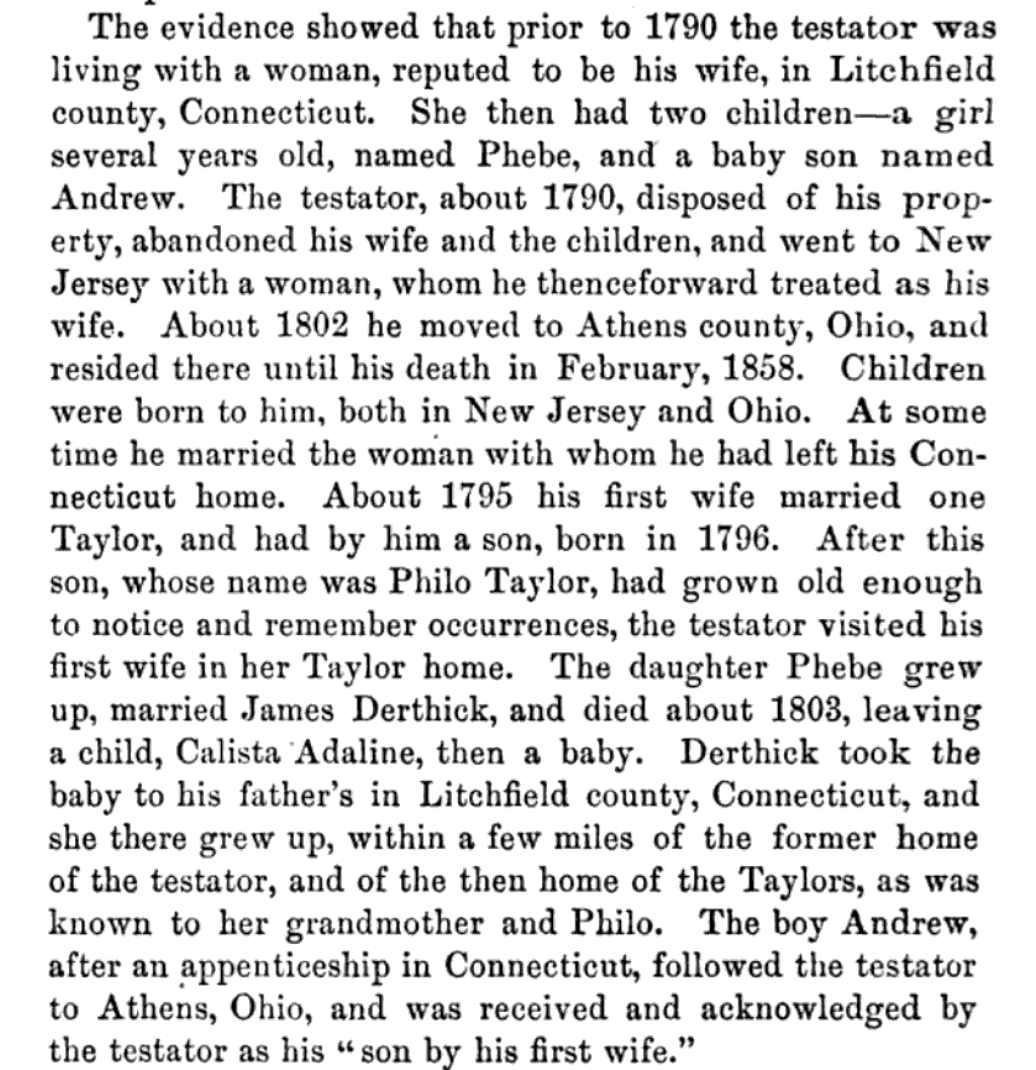 Is the “Miss” Olive Taylor who died on 29 February 1852 at Litchfield, Connecticut, USA my Olive (SCOVILLE) STEWART? I don’t know yet. The dates are could be right, but I wonder. In the testimony above it states that Olive’s son Andrew “after an apprenticeship in Connecticut, followed the testator [his father Daniel] to Athens, Ohio, and was received and acknowledged by the testator as his ‘son by his first wife.'” We find Andrew in an Athens County Tax list in 1810 when he would have been about 24 years old. I can not find Olive in 1810 or 1820 unless she is remarried. There are two Taylors in Litchfield in the 1800 census a Levi and a Jonathan. Perhaps she marries one of them should they become a widow? By 1810 she would be 44 so I would not expect children after that. So what if the scenario painted in the court case is false. What if there were no Taylor children and the Philo Taylor was just a grifter and opportunist staking a claim based on Phebe who had likely died young (not on the 1800 census). It seems odd to me that a child of Olive allegedly born within a couple of years of Andrew albeit by a different father would end up in the same place but never be acknowledged by Andrew as a half brother and furthermore not appear with their mother on the 1800 census when according to testimony they would be only four years old. It just doesn’t add up.
