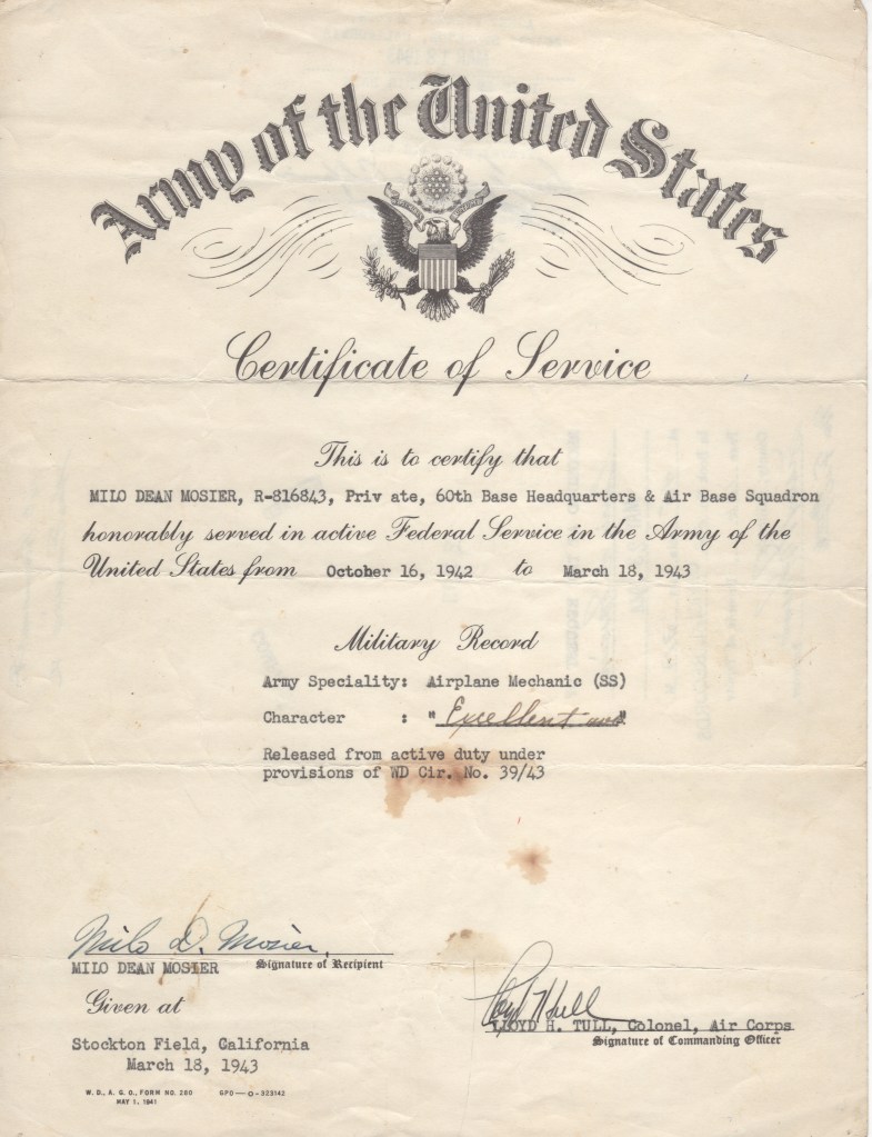 Maybe you are lucky enough to have some dog tags from a family member or even yourself. For those that wore them close to their heart imagine the stories they could tell. Dog Tags or Military Identification Tags have a long history which is well chronicled here. A soldier wore identification tags so, in the unfortunate circumstance that they were injured or killed, they would be identifiable. The following collection of dog tags were all issued to my grandfather Milo Dean MOSIER.