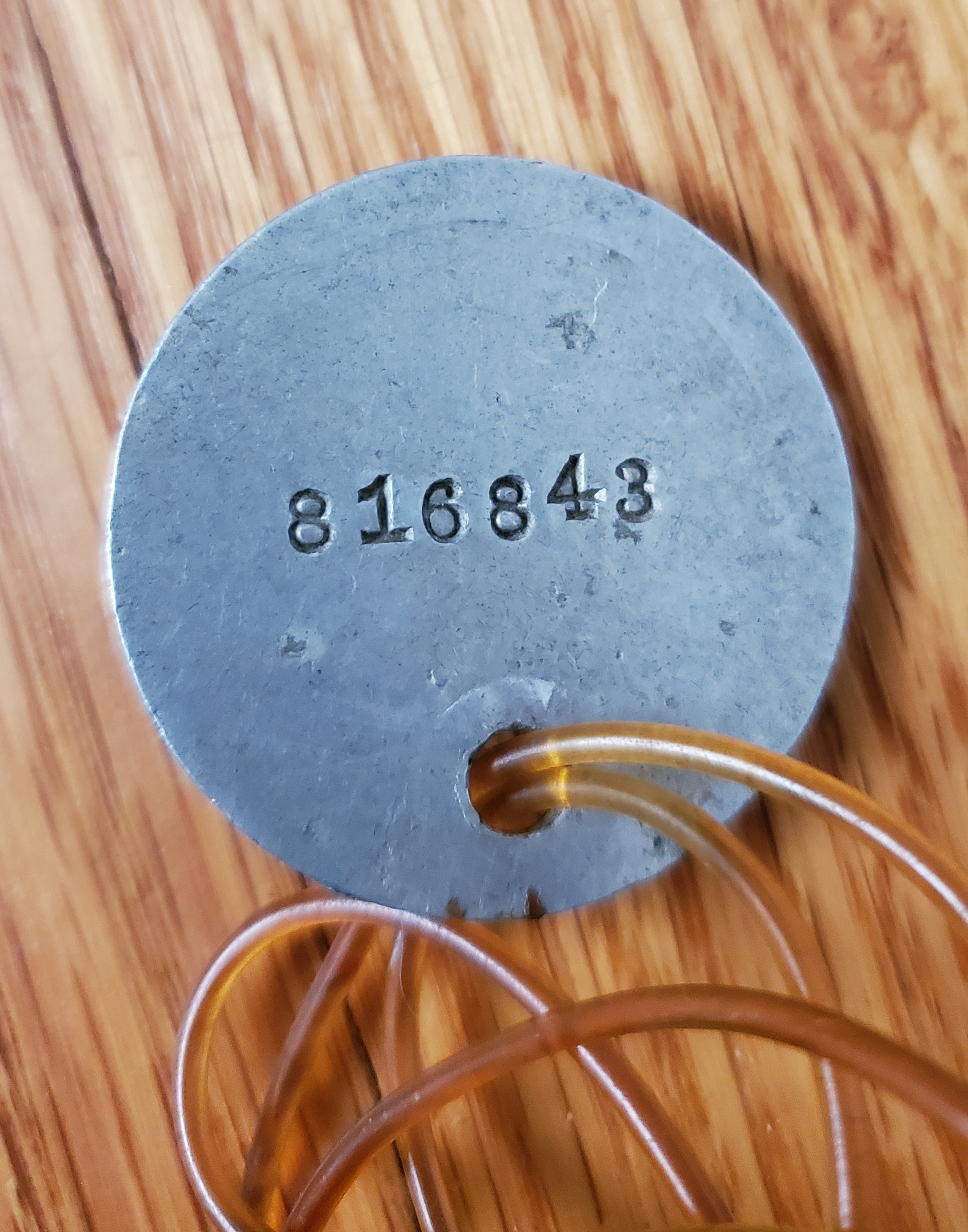 The rounded rectangular tags on the same aged nylon cord are from his service in the US Army in WWII where he served stateside as a Private at the 60th Base & Air Squadron at Stockton Air Field, California from October 16, 1942 to March 18, 1943. It is not exactly clear to me why he only served for 5 months.
