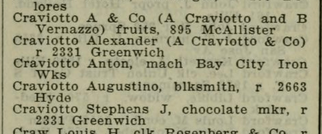 “A few days later she visits Laura again. Tuesday July 28 Bought nox tomatoes for 60 cents and made 17 qt chili sauce. ” Laura’s father has a produce company at 895 McAllister St called “A. Craviotto Company.” Note that it is owned by A Craviotto and B Vernazzo.