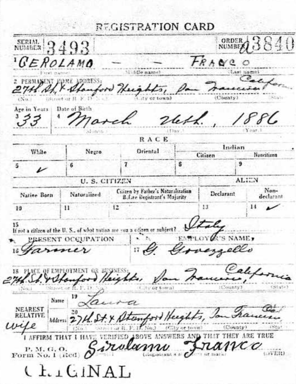 In 1915 we find That Giralamo’s draft card has him working as a farmer for G Gernazzo which I believe is Vernazzo at 27th Street and Stanford Heights. This is also listed as Giralamo and Laura’s address.