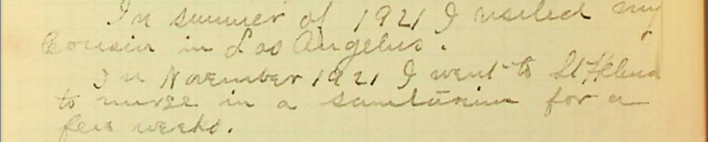 “In November 1921 I went to St Helena to nurse in a sanitarium for a few weeks.” Remember this all started with a Birth Certificate. My neighbor told me, at this time, most births were at home in St. Helena, so likely there was a complication and Laura Franco was hospitalized and gave birth to her daughter Yolanda Rosa at the hospital in St Helena. There she met my great grandmother Mary “Lulu” (PADEN) MOSIER while they were both convalescing. Perhaps they were even roommates. This birth certificate was filled out in error as the name should have been Yolanda Rose Franco, and not Giralamo. That is why the bottom was never completed. And this incorrect one perhaps was given to Lulu and she kept it in her diary to remind her of Laura and Yolanda and her time in St. Helena.
