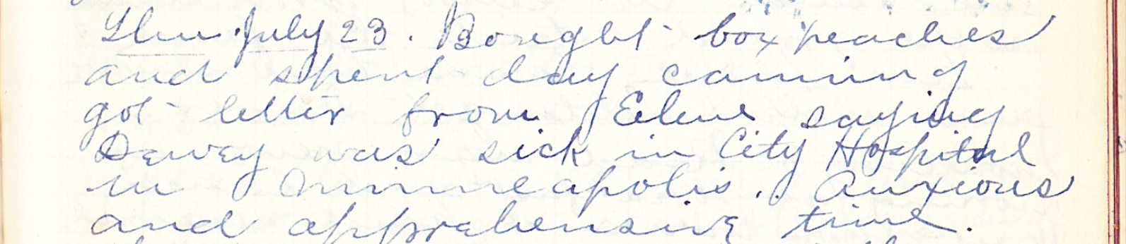 1914 “Thu July 23 Bought box peaches and spent day canning. Got letter from Eilene saying Dewey was sick in City Hospital in Minneapolis. Anxious and apprehensive time.”