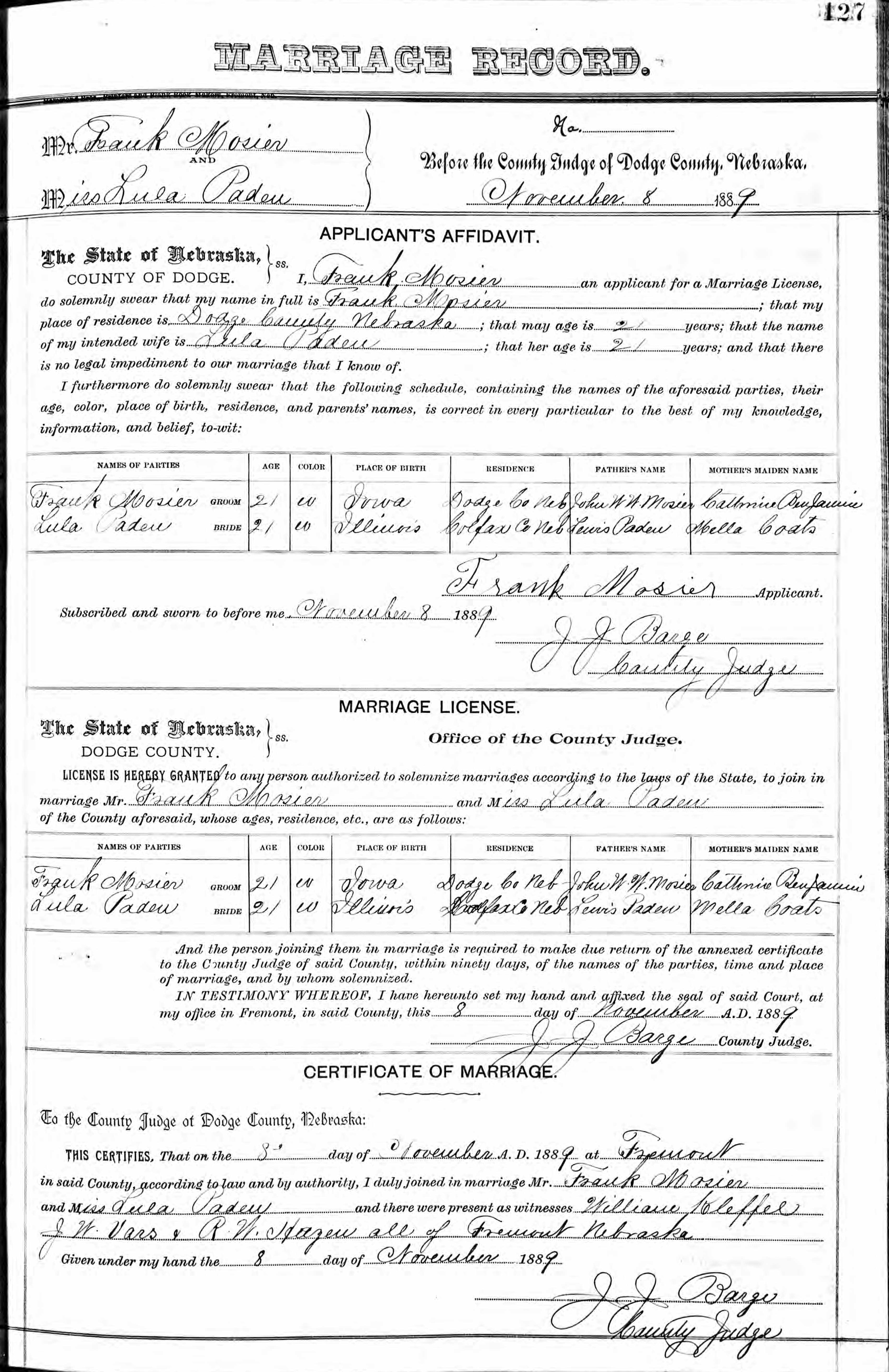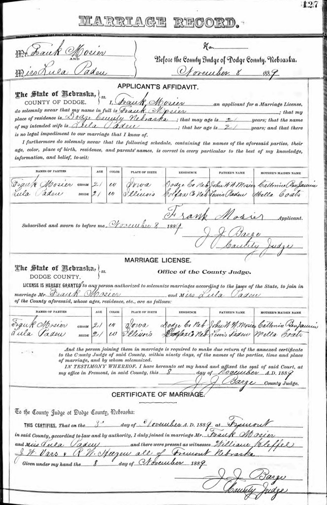 Mary “Lulu” PADEN was born at a time when most women had few choices. She was born of tough Scottish and German stock the 16th of November 1867, the first child to Civil War Veteran, James Lewis PADEN and his wife Millicent Almena COATS. She was joined by a dozen siblings including a set of twins, and no doubt she had a hand in helping to raise them. At the age of twenty-one she married Franklin Stewart MOISER, also of Scottish and German ancestry. A good scrutiny of the marriage license gives a valuable clue. Lulu and Frank were married by J. J. Barge, a County Judge in Fremont, Dodge county, Nebraska. None of the witnesses are family members. My guess is they did not approve.