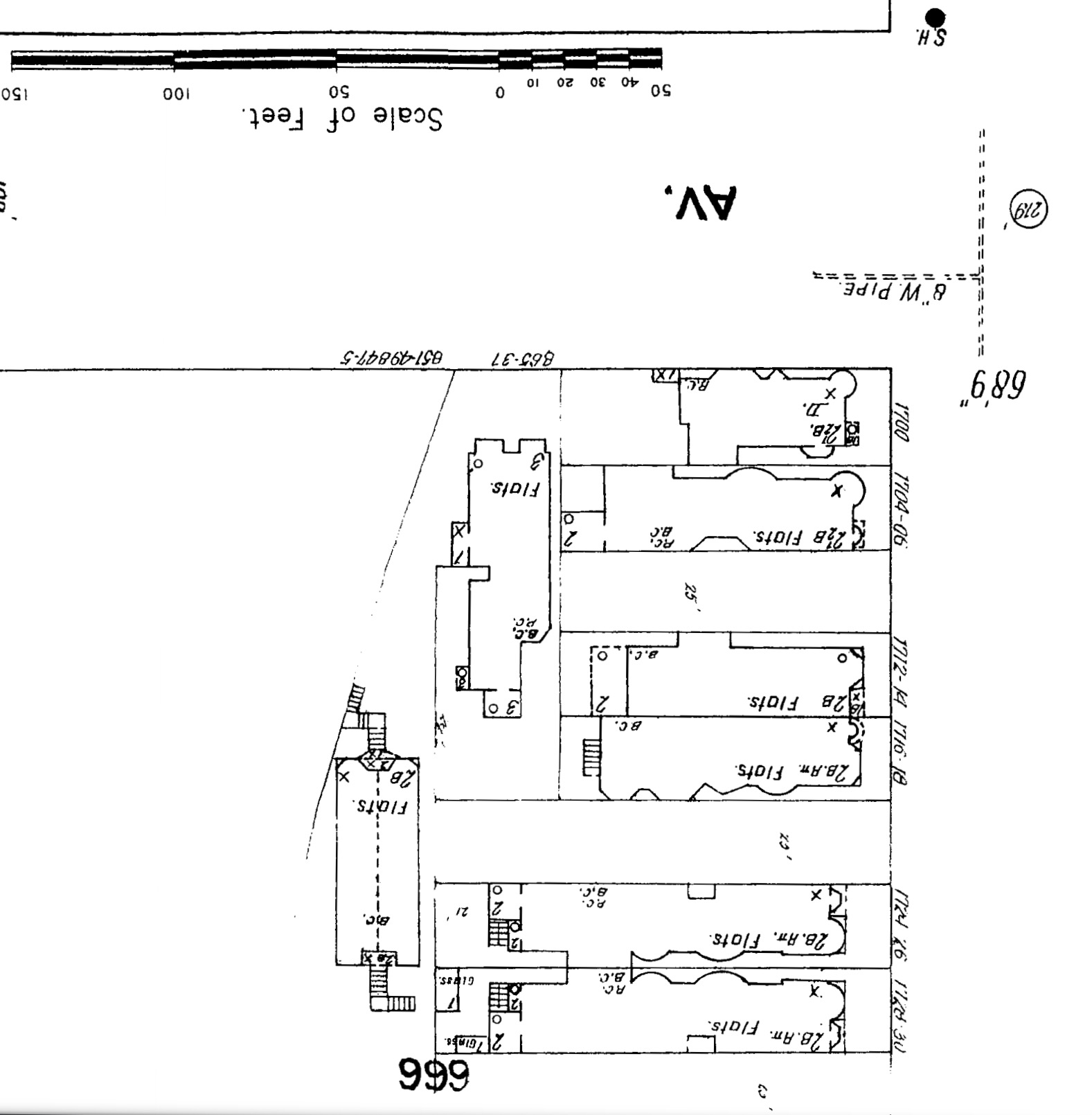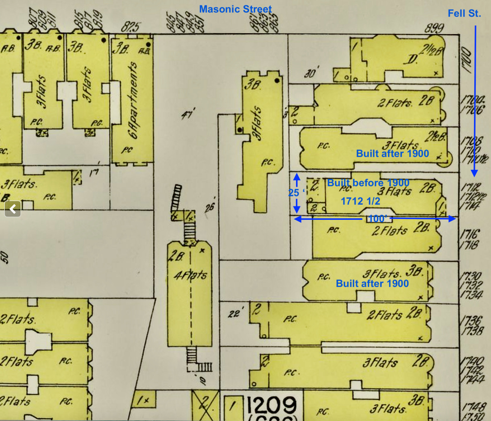 Taking a closer look at the Sanborn Fire Maps we can see changes. The lot sizes were 25 X 100 feet but in 1900 the lot was empty to the East of 1712 and there was a vacant one house to the west.