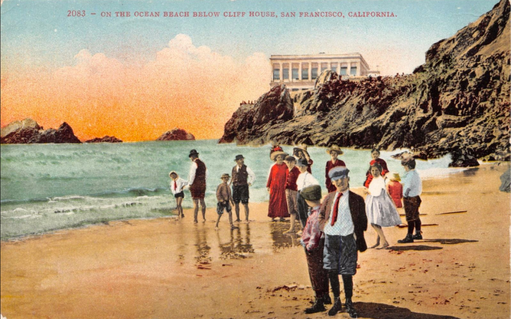 1913 Thu Oct 9 I hardly know just how to describe the events of this day for I saw two beautiful sights new to me and long looked forward to, the Golden Gate Park and the Pacific Ocean. I suppose if I had not been so tired I should have been greater thrilled. But there they were both grand especially the old ocean. Frank, Albert, Lolita, and Milo with myself walked the whole length of the park which is over 4 mi, beside we made a detour to see the different attractions which added to the distance. We had stopped to admire some beautiful swans when I looked across the boulevard to see Albert gazing away to the west. I crossed over and he says can you see it? I looked and looked away into the glimmering sky and then I saw the waves appear like shimmering silk in the distance. After a quite long walk we came to the sandy beach and walked down to the edge of the water. The tide was coming in and many an incoming wave lapped over our feet before we could get out of the way. It was wonderful. We waited till the sun went down and turned homeward reluctantly.