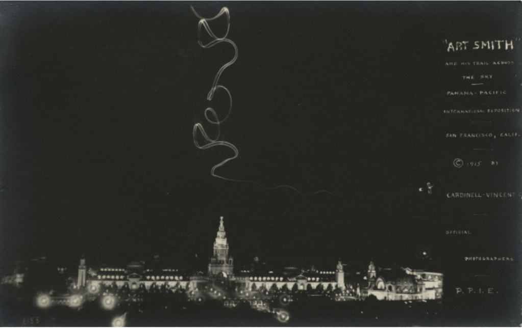 Art Smith performing a dive in his biplane at the Panama-Pacific International Exposition, San Francisco 1915