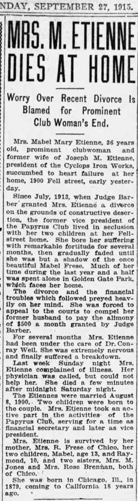 [Mabel is likely the same Mabel listed in Lulu’s diary as she lived at 1900 Fell St. at the same time Lulu lived at 1824 Fell less than a block away. It is interesting to note the circle of divorced women and their economic hardships.] On Sunday Dewey and I walked out to the park and inspected the pumping station the flower beds and ostriches and then came home. Frank had started that morning for Humboldt Co to look at land.
