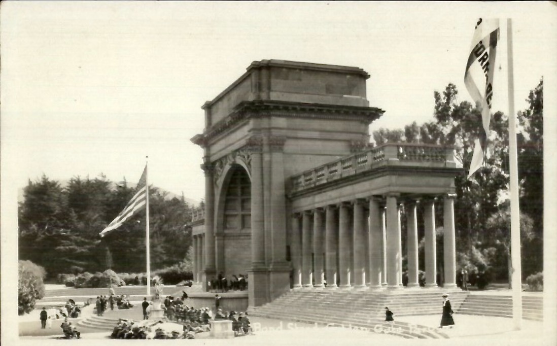 Sun 24 I got up quite early and after a generous breakfast I went to making button holes in my new coat. Jessie pressed the skirt and I put in the button holes and sewed on the buttons and we started to church. Got there in time to hear the sermon. Had a beautiful time there. After church was over and the newlyweds that had just been married had been duly congratulated and showered with rice we debated the question and Jessie said for us to wait and she and Syl would leave Lolita at Sadie Harris’s and take me for a ride I asked them to leave me at the music stand while they went out home for mother while I sat in the sweet Sep sunshine listening to the music of the municipal band the cool breezes played with the two big flags one the stars and stripes the other the California bear lazily filling up their soft folds and falling limp floating and rippling it seemed as if their silken folds were a living visible manifestation of the free and unfettered spirit of the winds of heaven.