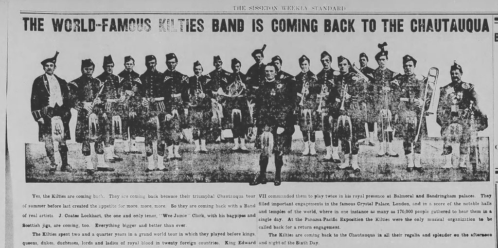 June 18 First day of the Chautauqua. Frank [Hoffman] had bought season tickets for Eilene and me and we attended every day during the week. The programs were filled by new talent each day and it was all of a high order, very entertaining and uplifting, amusing and edifying . I have a detailed list of programs in another book. The week ended on Sat night with a performance by the Kiltie band in full regimentals whose star performer was Wee Jamie Clark bag pipe major once seen and heard never forgotten.