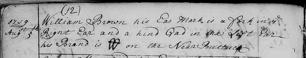 William BROWN combines his B on top of the W. Robert KNOWLES uses a backwards R with a K and finally William Mumford has a circle with a cross. But no other has a Fleur-de-lis or the intricacy of John SHELDEN’s brand. I will have a future blog post on the possible meaning or implications, but this bit of detail is lost if you do not look at the original records. And as I have previously mentioned the color photo I took in person is far more appealing than the black and white images. And if you are so inclined try doing a Google search on Animal Branding in the colonies—someone wanting to do a book could significantly add to what is out there…