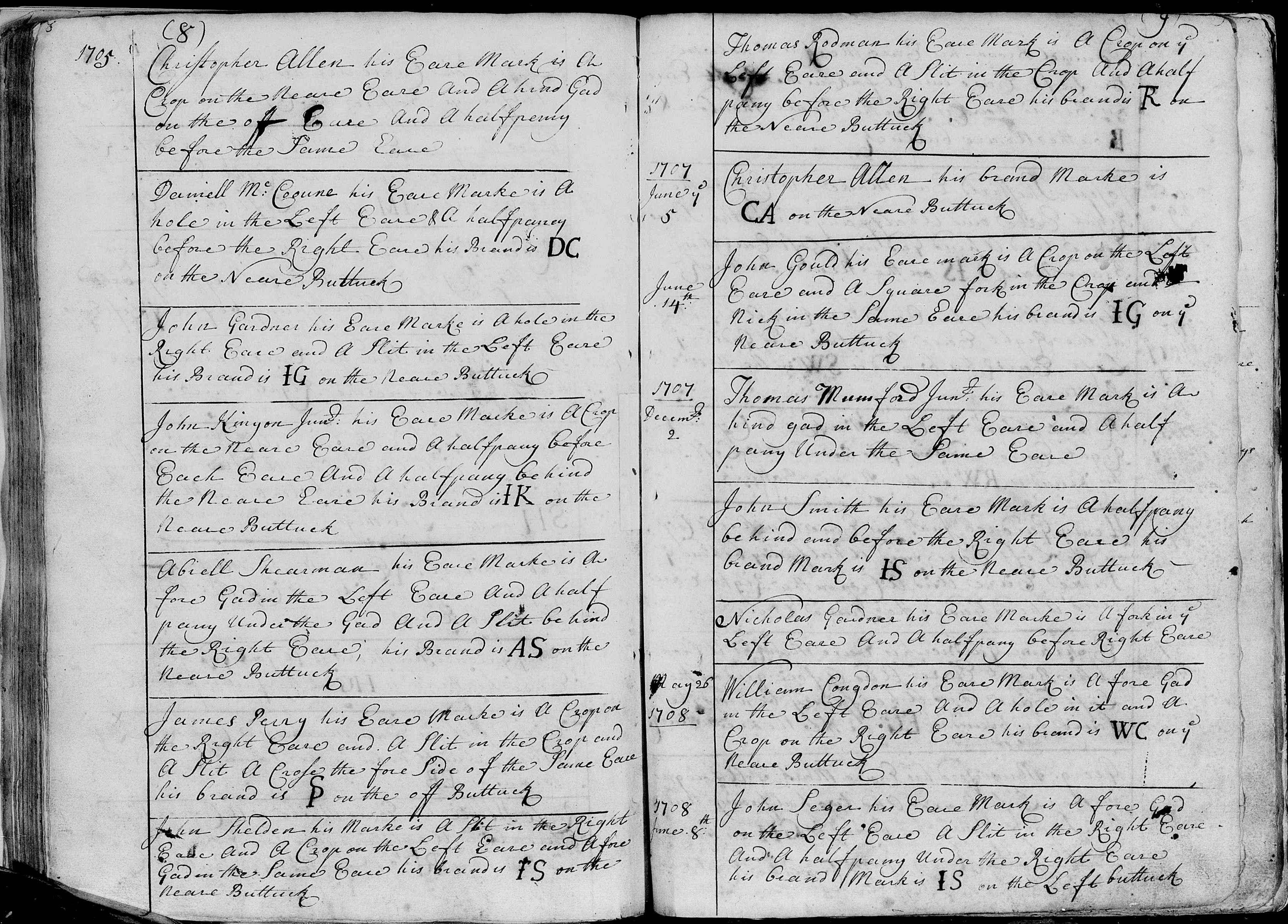 John SHELDEN is the first to be recorded with the initials “JS” so the Fleur-de-lis does not appear to be an embellishment to distinguish his brand from John SMITH [but it effectively does] as seen above whose brand is on the neare Buttuck. Or from John SEGER who brand was on the Left Buttuck. You will also note that most of the brands including those on these two pages are simple initials. We have a couple more creative ones.