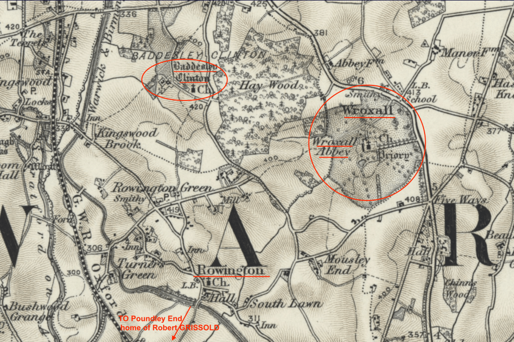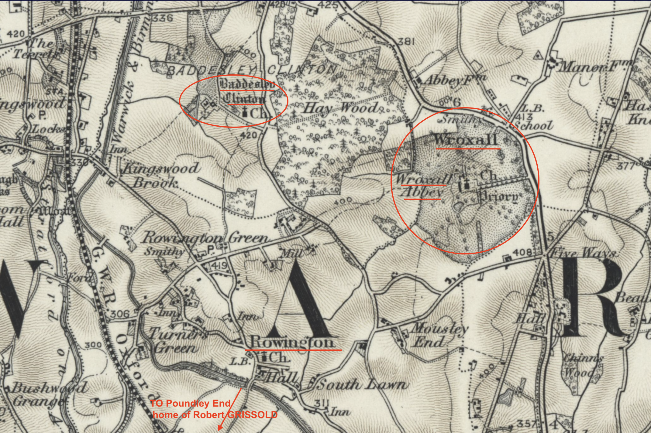 • Mr [William] SHELDON of Broadway’s servant Robert GRISSOLD of Rowington is arrested and hung in 1603 for being unwilling to renounce his Catholic faith and his association with the priest John Sugar who was conducting mass at Baddesley Clinton. [Distance from Broadway to Rowington about 26 miles–somewhat a curious connection]