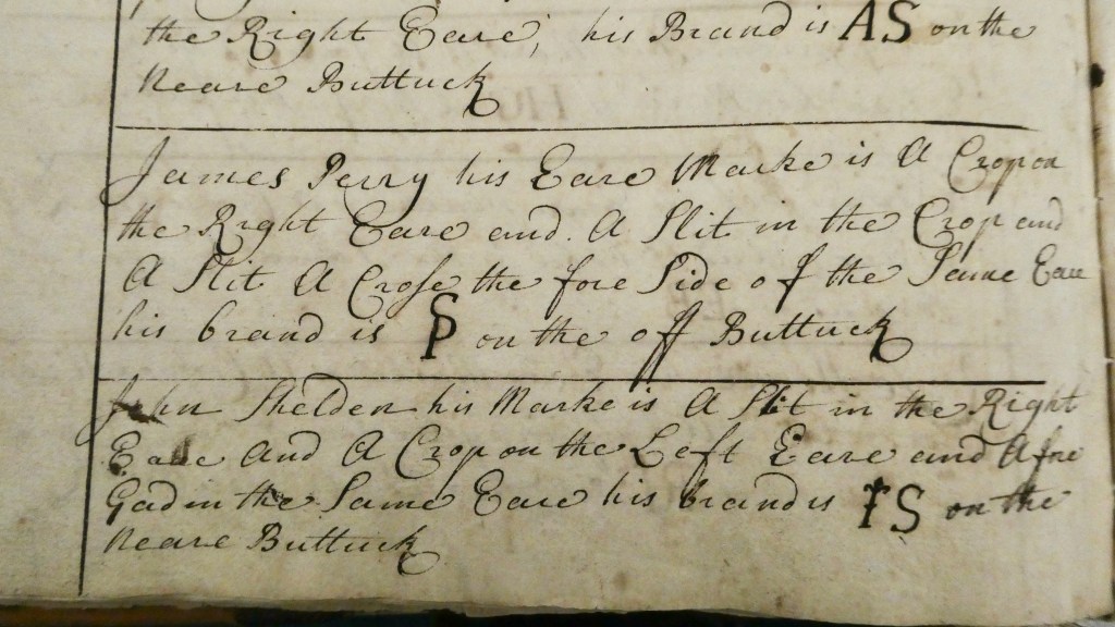 Below is the brand of John Sheldon: “John Shelden his Marke is A slit in the Right Eare And A Crop on the Left Eare and A Afore Gad in the Same Eare his brandes JS on the Neare Buttuck”. When a J was used on other brands they also didn’t have the hook and did have a line through the center, but only John’s is topped with a fleur-de-lis.