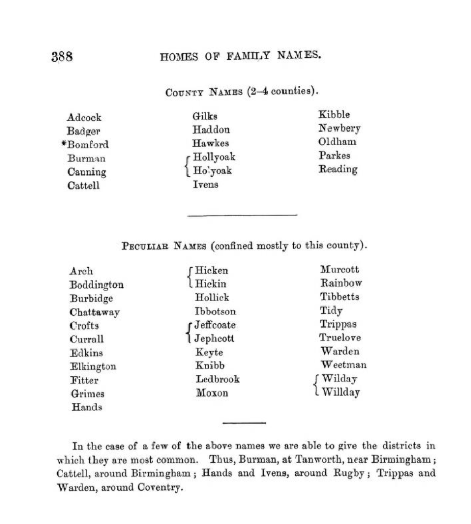 Perhaps our favorite names are what Guppy calls Peculiar names. These are names that are found in specific geographic areas and not widely distributed elsewhere, which helps us home in on where they come from. Let’s take a look at Guppy’s list for Warwickshire:
