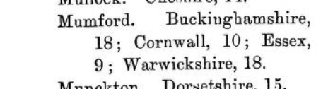 Looking at our names from my last Blog post we find mentioned above is the name MUMFORD. Guppy says it appears in 4-10 counties. And if we flip to the back of Guppy we find he gives the relative distribution of MUMFORDS per 10,000 in 1890 when the book was published. So this reduces our list of places to look for MUMFORD from all the shires in Great Britain down to just 4 with the highest concentrations in Bucks and Warcs. It’s definitely a good start. And since we think the MUMFORD’S in Windsor Connecticut may hark from Warwickshire it gives us another tidbit of evidence. If we end up with a Peculiar name like BURBAGE we have likely found our origin.
