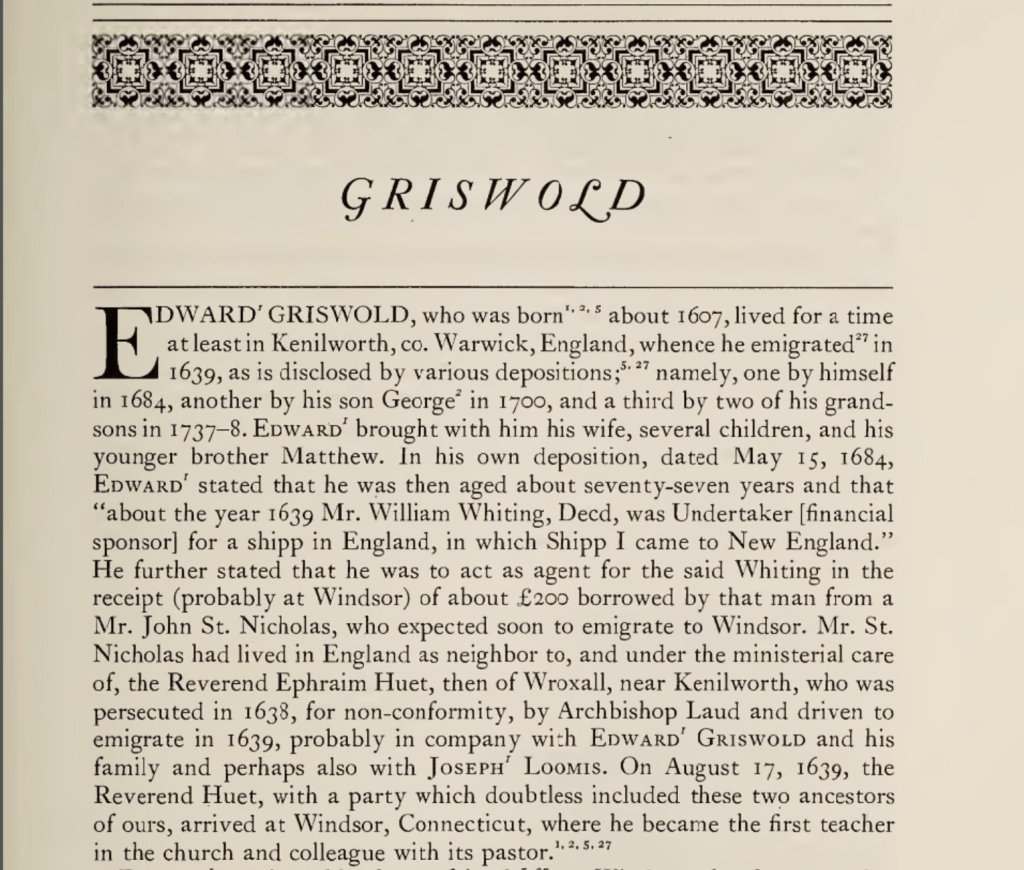 • Francis GRISWOLD bpt 10 Jan 1605 at Wootton Wawen, Warcs; son of Clement and his cousin Edward GRISWOLD bpt 26 Jul 1607 at Wootton Wawen, Warcs; Son of George. Wootton Wawen is about 8 miles from Wroxall. This is solid previously proven information. These two are cousins. Arriving with Rev. HUIT and is documented first hand.