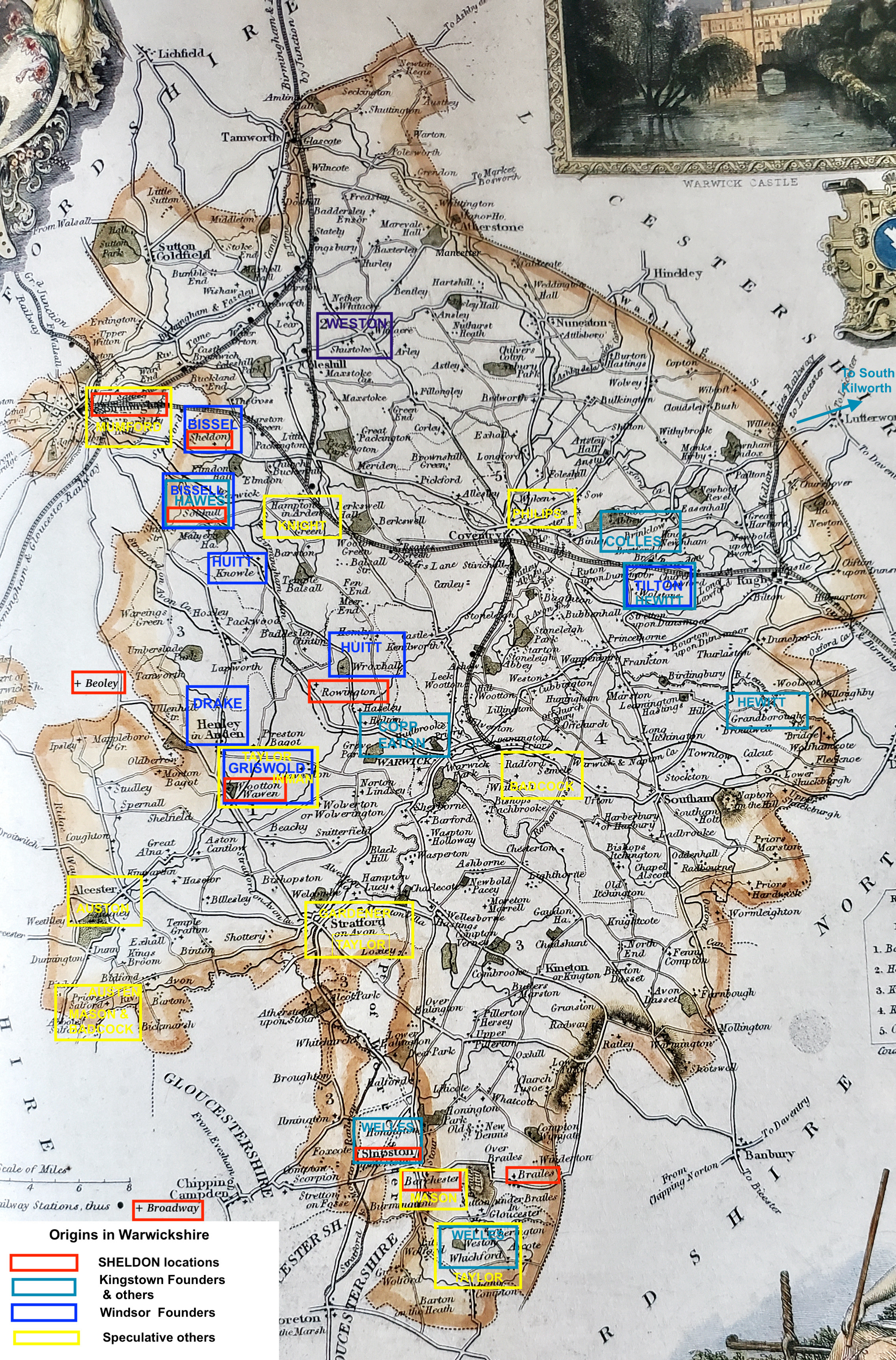 So perhaps it is helpful to plot our knowns and possibilities on a map. Red are known SHELDON places. Dark BLUE Windsor Connections. Turquoise Blue Kingstown or other connections and finally Yellow for speculative connections.