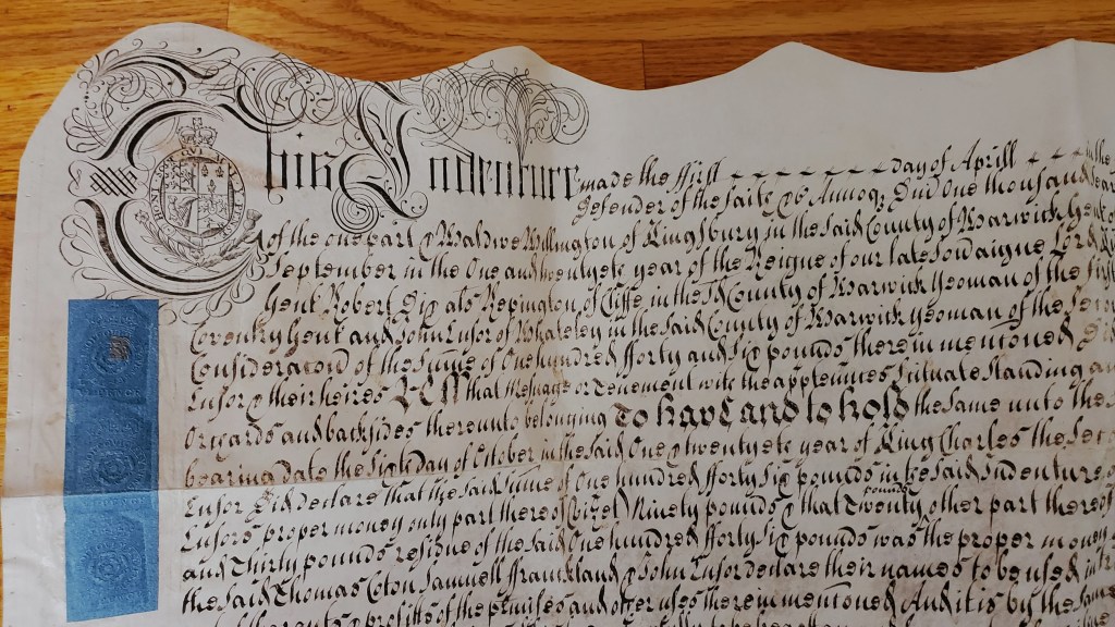 And in the interest of sharing and the hopes I might by doing so, provide information for family members or other researchers, I post here a recently purchased document from Warwickshire. It is not, to my knowledge, associated with any of my traced families in Warickshire but it definitely has families that intermarried with SHELDONS, BROME, GRESWOLD in Warwickshire include SHAKESPEARE, COTON, WILLINGTON. Other names in the document: KNIGHT, REPINGTON, ENSOR, FULLWOOD, FRANKLAND, SWIFT, FALKESBRIDGE. Place names In Warwickshire include Kingsbury, Cliffe, Little Packington, Whately, Coleshill, Bromefields, Fither’s Farm, and Nether Whitacre. Elsewhere we have Little Hallam in Derbyshire and Hinckley in Leicestershire. Many related documents can be found at the Warwickshire Record Office and the Shakespeare Trust in Warwick and Stratford on Avon respectively. But not to my knowledge the counterpart to this one.
