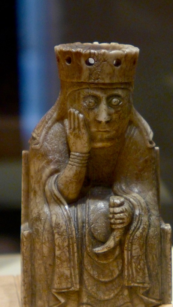 The chess piece above is from the Lewis Chessman. The Queen’s head, resting upon her hand, speaks to me of mix of concentration, patience, boredom, amusement, and wisdom. She holds in her hand the horn of abundance. In a game of chess, surrounded by men, the women are few, but alas the most powerful pieces on the board, they bide their time…