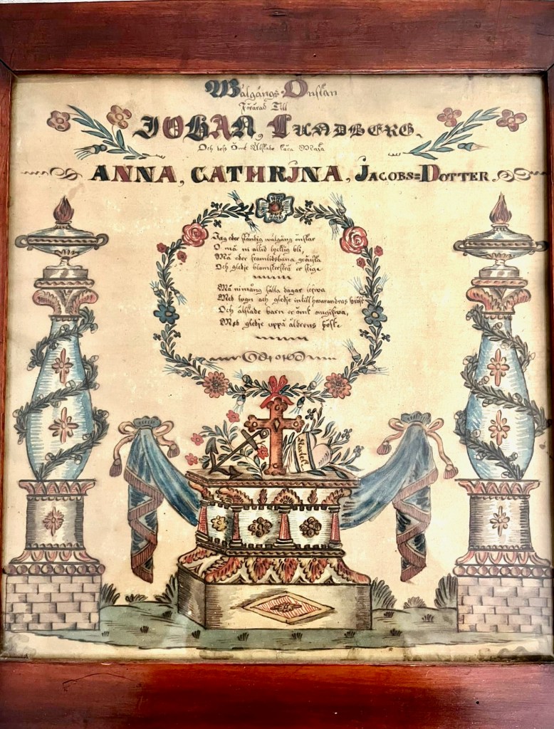 Well just after I started this blog post i got an invitation from a distant cousin in Sweden Casja Lundburg to a new group for our Lundberg family on Facebook. Whereupon another cousin posted this lovely painting that was likely done in remembrance of Johan Soloman Lundberg’s Parents Johan Petter Lundberg and Catharina Jacobsdotter’s marriage. They the great-grandparents of Roy Sidney Lundberg and parents of his grandparents who gave him the bible!