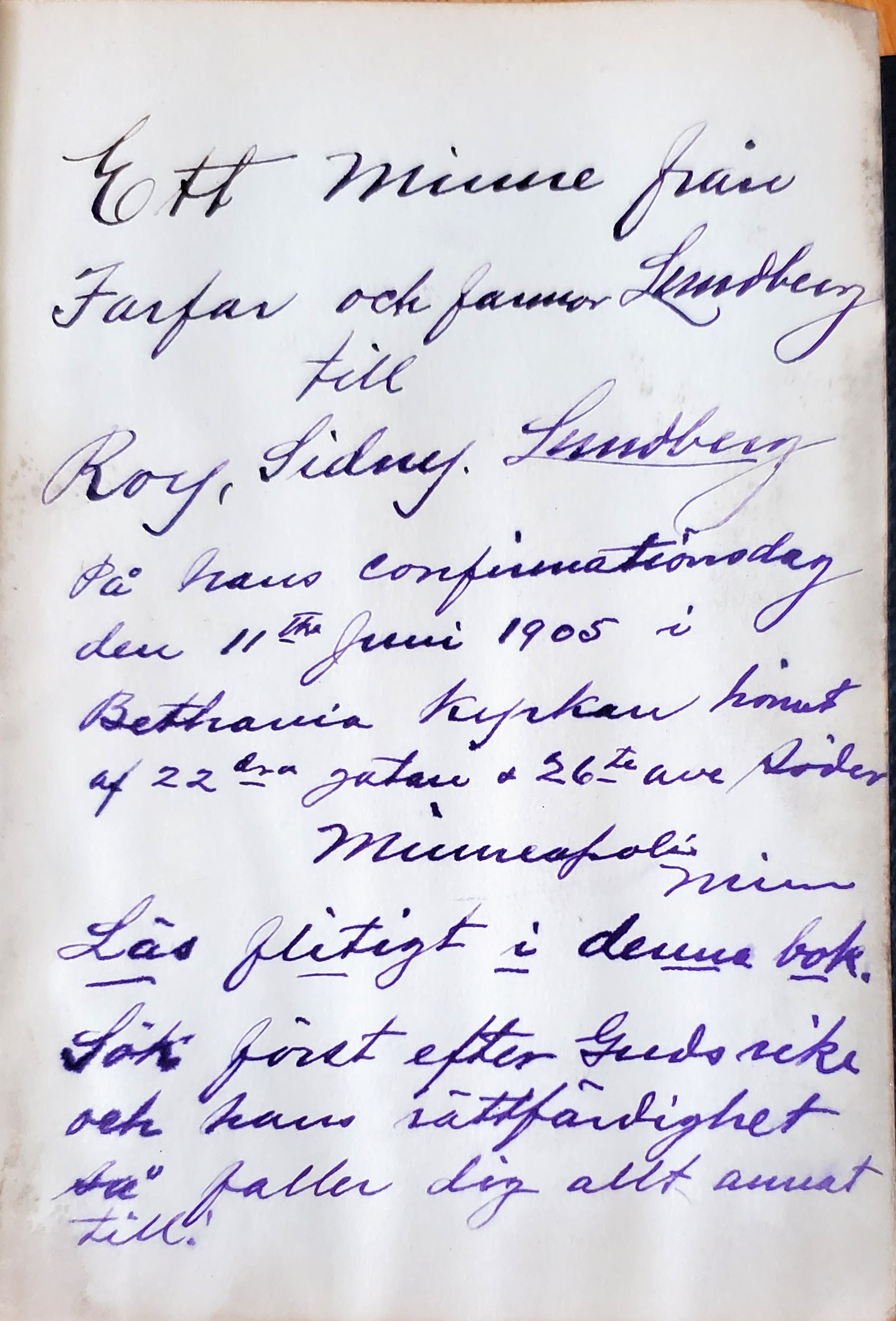 Translation: “A token from [paternal] grandfather and grandmother Lundburg to Roy Sidney Lundberg on his confirmation day 11 June 1905 in Bethania Church corner of 22nd street & 36th ave south Minneapolis Minn. Read this book frequently. Seek first the kingdom of God and his righteousness. Everything else will fall into place when the timing is right.”