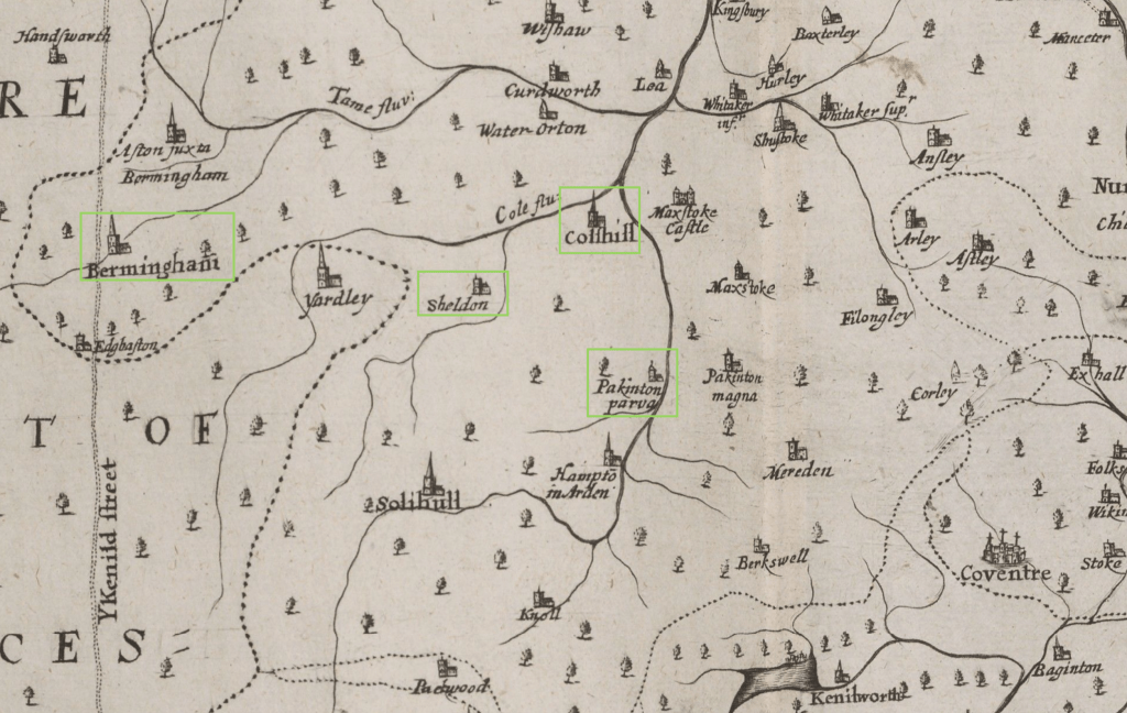 One of my Warwickshire ancestors is Nicholas BROME (1450-1517) my 13th great-grandfather. In an obscure thesis I find reference to the Manor of Little Packington which originally belonged to the cathedral Priory but was then at the dissolution granted to William WILLINGTON and William SHELDON. This is William WILLINGTON father of Mary WILLINGTON (1502-1553) who married William SHELDON (c1495-1570) of Beoley son of Ralph SHELDON of Sheldon tapestry fame. And just a few years later it is in the possession of Thomas BROME and his wife of Woodloes. Thomas BROME is the great grandson of Nicholas BROME [my 13th great grandfather] of Baddesley Clinton and Woodloes. In 1653 the manor was sold to Thomas Fisher and it has since generally followed the descent of Great Packington. What is interesting is that the Indenture contains both a Brome fields and a Fisher’s farm. The parish church of St. Bartholomew Little Packington is no longer a church but has been turned into a residence. George SHAKEPSEARE in his will dated 30 May 1719 gave to the churchwardens and overseers £10 to be laid out in land or secured, in order to lay out 10s. in bread yearly to the poor of Little Packington. (on map below it is shown as Pakington parva. Also Bermingham=Birmingham; Colshill=Coleshill)