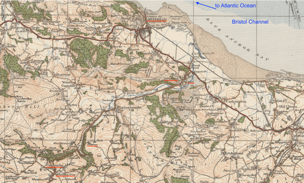 Then the record is silent for nearly 185 years! There are mentions of the place name Wheddon but none of that name or similar in the area. Then the 23 November 1559, Agnes Littlejohn and William Whetton are married at St. Mary Bridgewater [about 30 Miles east of Cutcombe]. In 1571 is a deed of Thomas Luttrell Esq to and a Thomas Withey alias Wheddone. [In 1376 Lady Elizabeth Luttrell purchased Dunster Castle from Sir John Mohun and it remained in Luttrell family hands until 1976 when it become part of the National Trust]