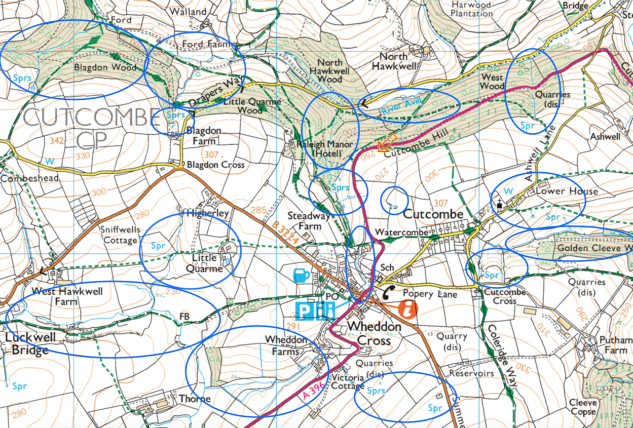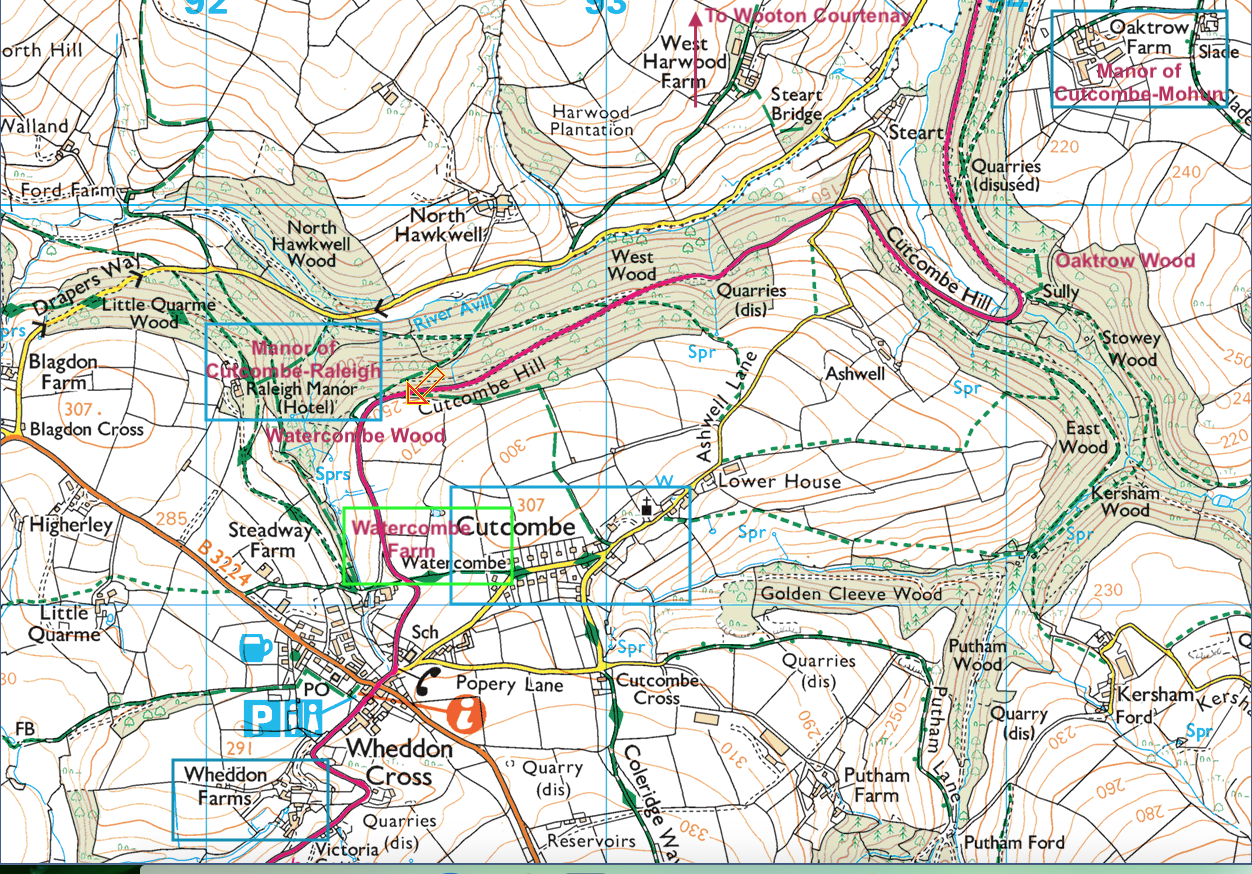 In the Inquisition of Sir John de Mohun from 1285: “Wadendene [alias Uhetnedene, Wetdene]. 1/2 knight’s fee held by Walter de Wadedene [alias Wetendene]. This seems an apt description given all the waterways and springs I have marked on the map below. This area is bordered on the West by the Quarme River and the North the Avil River and everywhere you look are water courses and freshwater springs. Also note a place called Watercombe adjacent Cutcombe. Essentially Watercombe and Wheddon are the same thing. Water + combe = water valley.