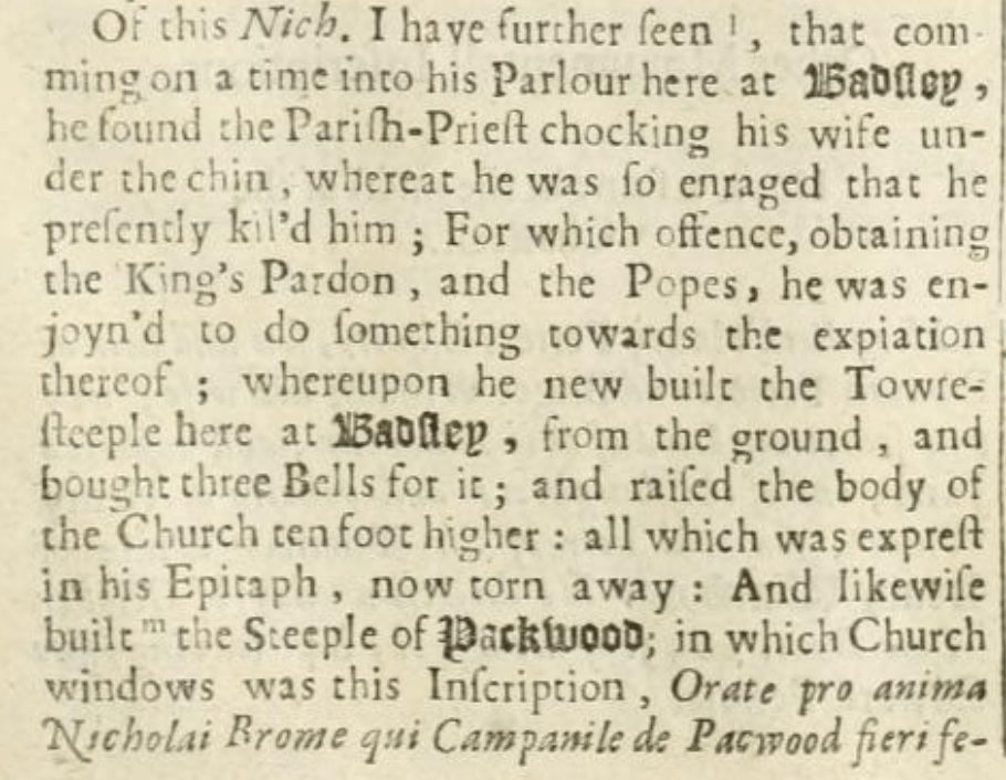 As you read in the Part Two, Nicholas paid blood money for the life of John HERTHILL to HERTHILL’s his wife. The amount or value placed on a person’s life was based on their status. When Nicholas killed a priest the value was much higher than for other mortal souls. He had to reckon with the church. The price Nicholas BROME paid for the death of the priest, was dear in monetray terms. He was “joyn’d to do something towards the expiation thereof; whereupon he new-built the Tower Steeple here at Badsley, from the ground, and bought three Bells for it and raised the body of the church ten feet higher: all which was expressed in his Epitaph, now torn away : and likewise built the Steeple of Packwood; in which Church Windows was this inscription, Orate pro anima Nicholas Brome qui Campanile de Pacwood fieri fecit” [Pray for the soul of Nicholas Brome who made the Bell tower of Packwood]. This would not been a small sum to renovate Baddesley Clinton’s church and add a tower to it and the church at Packwood nearby. [see map above –NW of Baddesley Clinton] Below are the two towers Nicholas BROME funded—know to some as the “Towers of Expiation [or Atonement].”