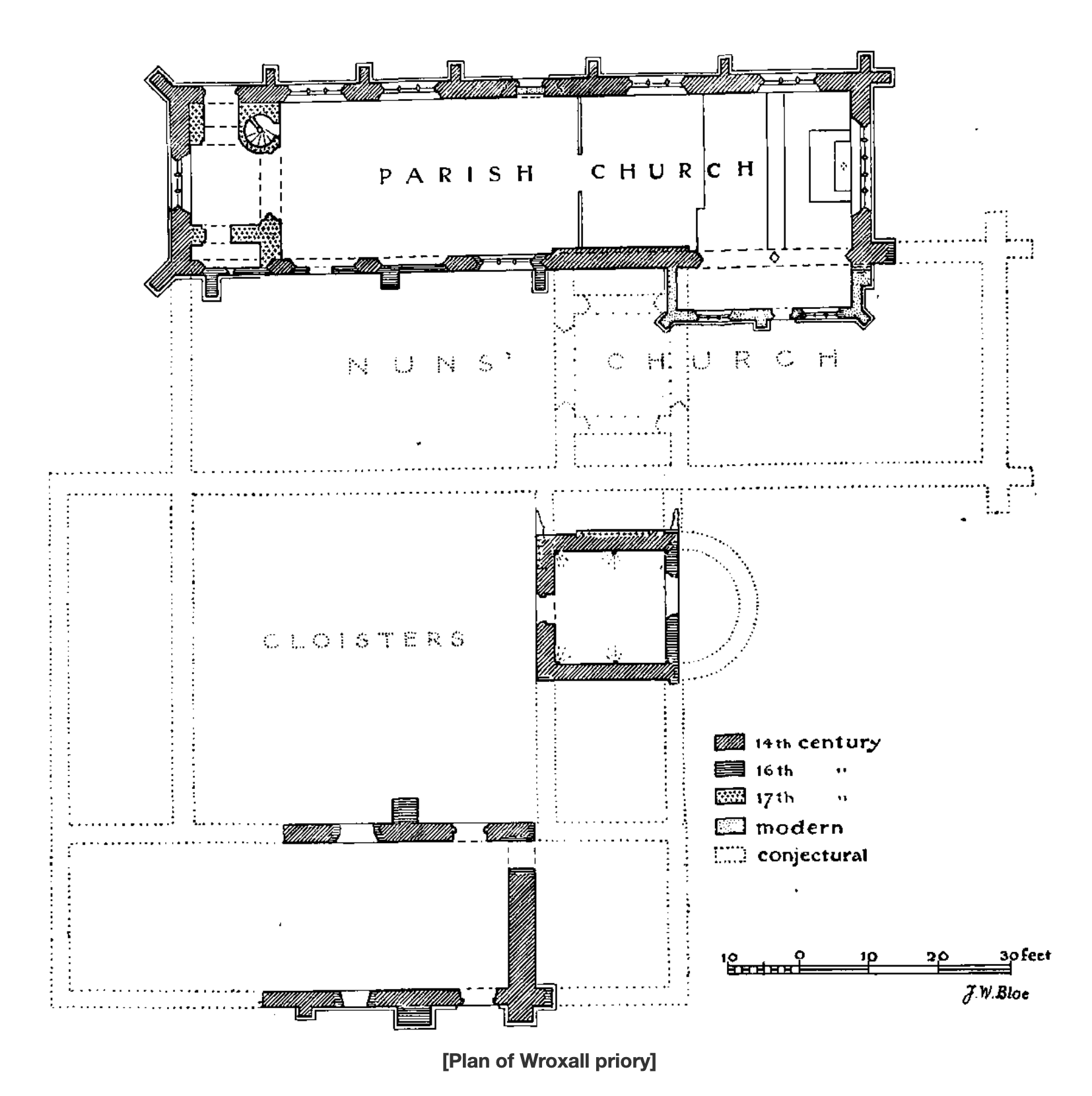 Fragments of cloisters, Wroxall Abbey Together with the north aisle of the abbey, now Wroxall church, this is all that remains of the 12th century Benedictine nunnery at Wroxall by Robin Stott and Plan of Wroxall from A History of the County of Warwick: Volume 3, Barlichway Hundred.
