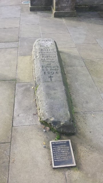 Here lies a Scottish hero, Sir John Stewart, who was killed at the battle of Falkirk, 22nd July, 1298 †.” By Leslie Barrie, CC BY-SA 2.0, Link