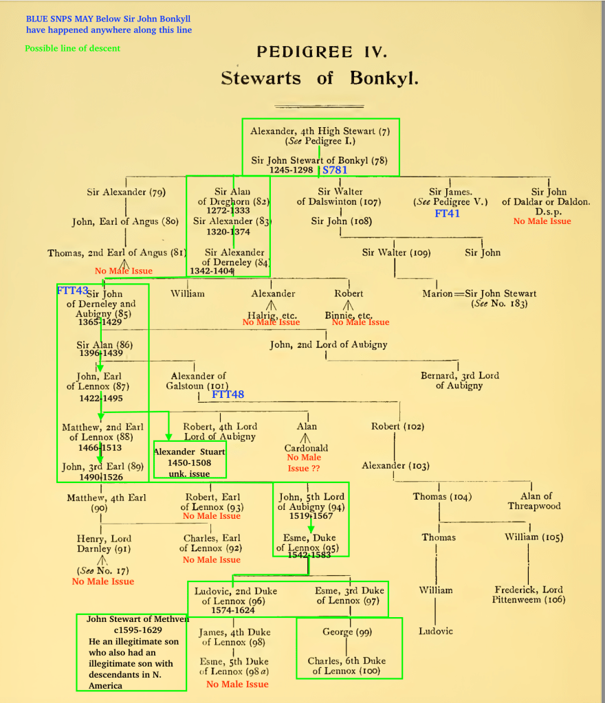 The above pedigree I have annotated to show the YDNA SNPS that identify Different branches and the green boxes denote possible lineages that could be the connection. There are not easy answers to our STEWART conundrum. There are thousands of descendants but many lines daughter out. Knowing the SNP associated with our branch descending from Sir John of Bonkyll helps in eliminating possibilities. There are also issue not included in the chart specifically around other sons of Sir Alexander STEWART of Darnley and his son Sir John STEWART’s other issue not recorded on this chart. It would appear we descend from either through an un-researched line or through illegitimacy. In the chart above there are several possibilities Alexander STEWART son of Matthew the 2nd Earl of Lennox if he had male heirs. The John STEWART Methven illegitimate son of Ludovic 2nd Duke of Lennox or an unknown descendant or Esme STEWART Third Duke of Lennox. Or one of the unrecorded brothers of the aforementioned STEWARTs. The DNA proves the connection but it is the Gap that needs Minding.