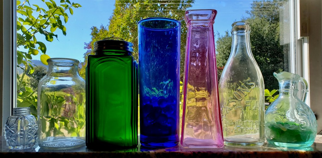 What intrigued me in Elsie Paden’s letter was the following description: “I distinctly remember Asa’s room in Grandma’s farm house. It was small, on the southwest corner of the second story, having two windows, one on the west and one on the south. Asa Collected bottles of every color, shape and size. He had them tastefully arranged on the window sills, and on other furniture in his bedroom. The sun reflected through the colored bottles made lovely rainbows on the walls. He could name the places he found the bottles and loved telling about them. He kept them washed and shiny. So you see why I feel quite sure ‘insane’ is a cruel word to describe him. I presume people in that era could not understand how one could be sane and collect bottles! He was such a gentle, kind person and did whatever he was told to do with no complaint. He had plenty of opportunity to find bottles as the homestead was on the Mormon trail from Council Bluffs, Iowa to Salt Lake City.” This description of Asa written and read by me over 48 years ago stuck. I can see a rainbow reflected on a wall and think of my Great Uncle Asa, who I never met. Such is the power of word pictures to build a connection with our past.