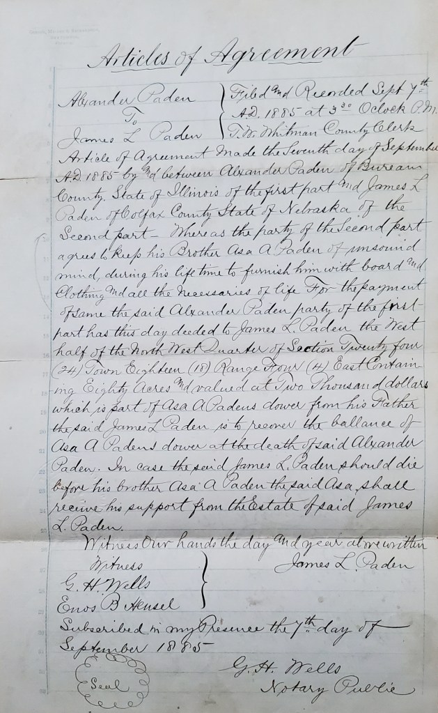 Asa, never married, never had children. There are few left to remember him, but I wanted to give him his due. When I wrote to my 3rd cousin, Malia Hammerstrom, I found out she had written about Asa a few years ago. I am grateful to her for letting me share her photo of his gravestone and for her additions to Asa’s Story. Thanks are also due to my cousin, Nancy. I have the document between Asa’s father and his brother, James L, arranging for his guardianship and care. It reads in part “Whereas as the party of the second part agrees to keep his brother Asa A Paden of unsound mind, during his life time to furnish him with board and clothing and all the necessities of life For the payment of same the said Alexander Paden party of the first part has this day deeded to James L. Paden….80 acres and valued at Two Thousand Dollars which is a part of Asa A Paden’s dower at the death of Alexander Paden. In case James L. Paden should die before his brother Asa A Paden the said Asa shall receive his support from the estate of said James L. Paden.