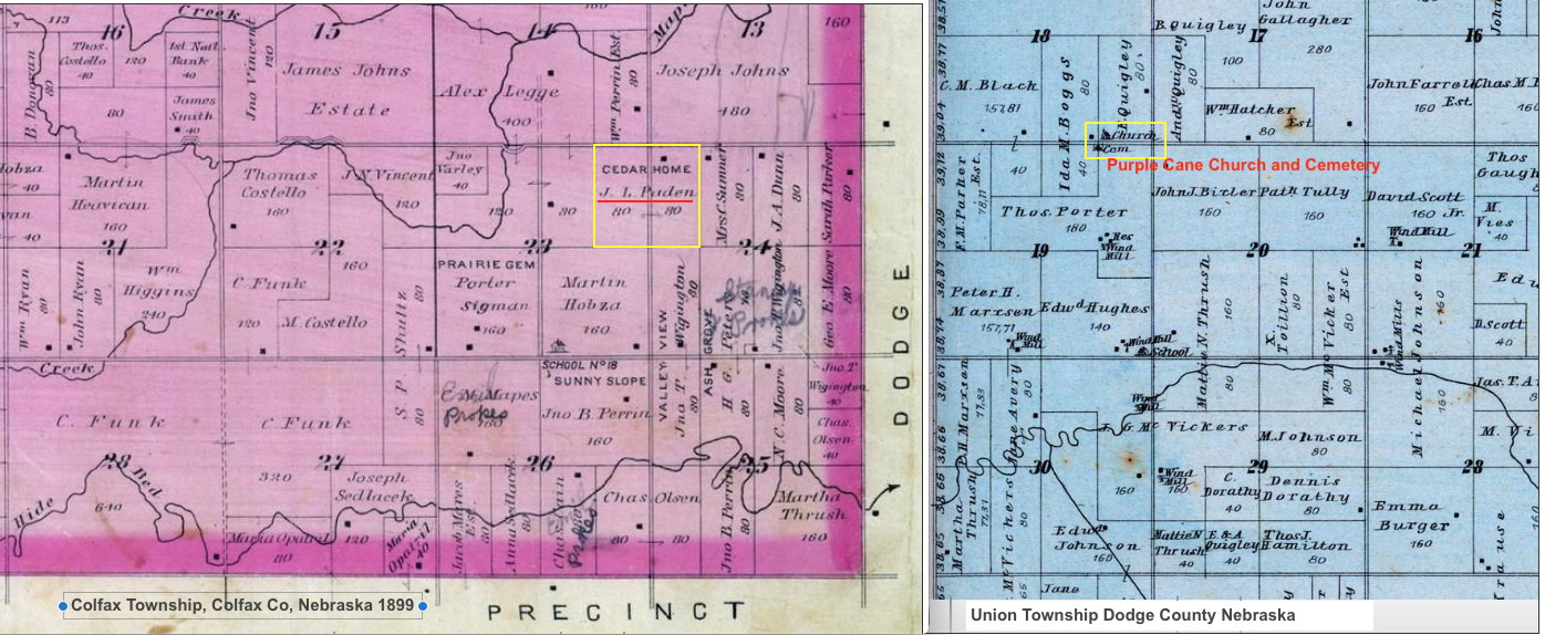 I can not find Asa in 1900 but I do find him in 1910 after his brother James L PADEN has died and he is living with his sister-in-law, Millie and family on the Paden farm pictured above. Asa is listed as being able to read and write but “none” is listed for his occupation. I muse, they should have listed him as a “bottle collector. As Elsie and Malia noted the Mormon Trail, as it came through Nebraska, it took various routes. In 1851 flooding and heavy rainfall forced the Mormons to take a more northern route. The Paden homestead was located in Colfax County in the southern and eastern part, right where the 1851 trail comes through. This makes Asa’s searching for cast off items along the trail make sense.