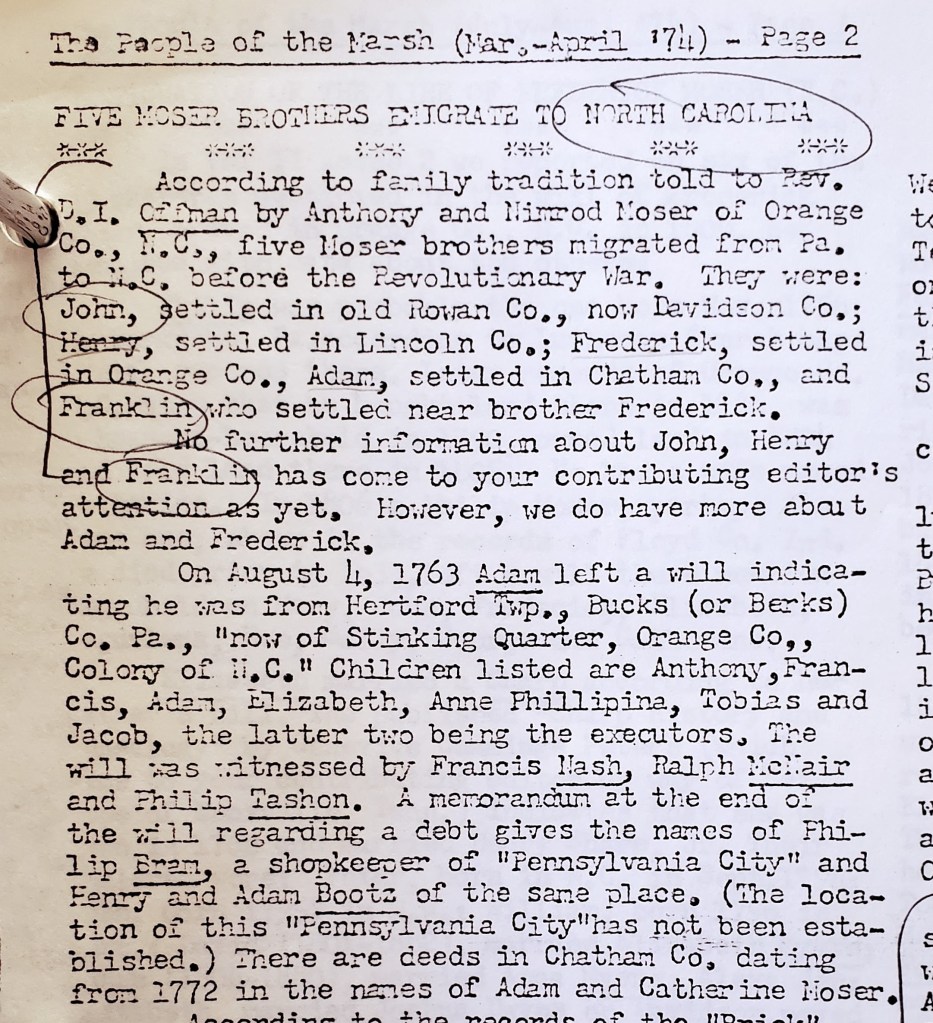 Johan Martin MOSER (1693-c1643) is my immigrant ancestor from Germany or was it France? I first learned about him in the 1970’s with the help of Charles Recker’s newsletter about MOSIER- MOSER families called “The People of the Marsh.” From there I got in touch with Lee MOSIER, who at the time of our first correspondence lived in Las Vegas but later returned to his home town of Carmen, Oklahoma. At the time of this correspondence there were dozens of MOSERs who believed their MOSER ancestors were related but the family legends lacked proof. Below is an excerpt from an article in “People of the Marsh” that suggests that there were 5 MOSER brothers that immigrated from Pennsylvania to North Carolina.