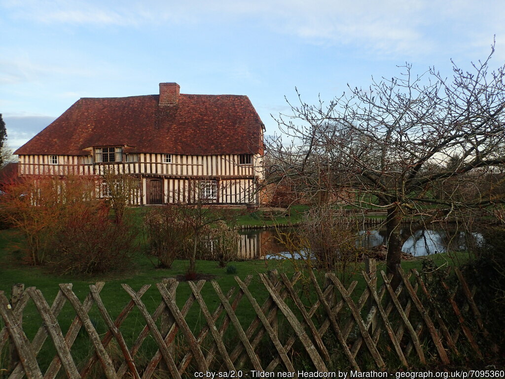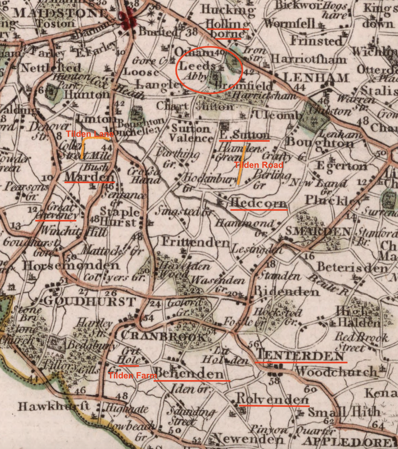 In the Domesday book the closest listed place to Headcorn is [East] SUTTON which had 15 villagers. 9 smallholders. 10 slaves; 8 ploughlands; 2 lord’s plough teams; 4 men’s plough teams; 8 acres Meadow. 50 acre Woodland swine render. 1 church. Annual value to lord: 12 pounds in 1086; 10 pounds when acquired by the 1086 owner; 10 pounds in 1066. Tenant-in-chief in 1086: Bishop Odo of Bayeux who also held Leed’s Castle. Curiously I can find no record referring to TILDEN people or places near Headcorn in the 12-16 centuries, so it is unclear when the road and buildings adopted their name.