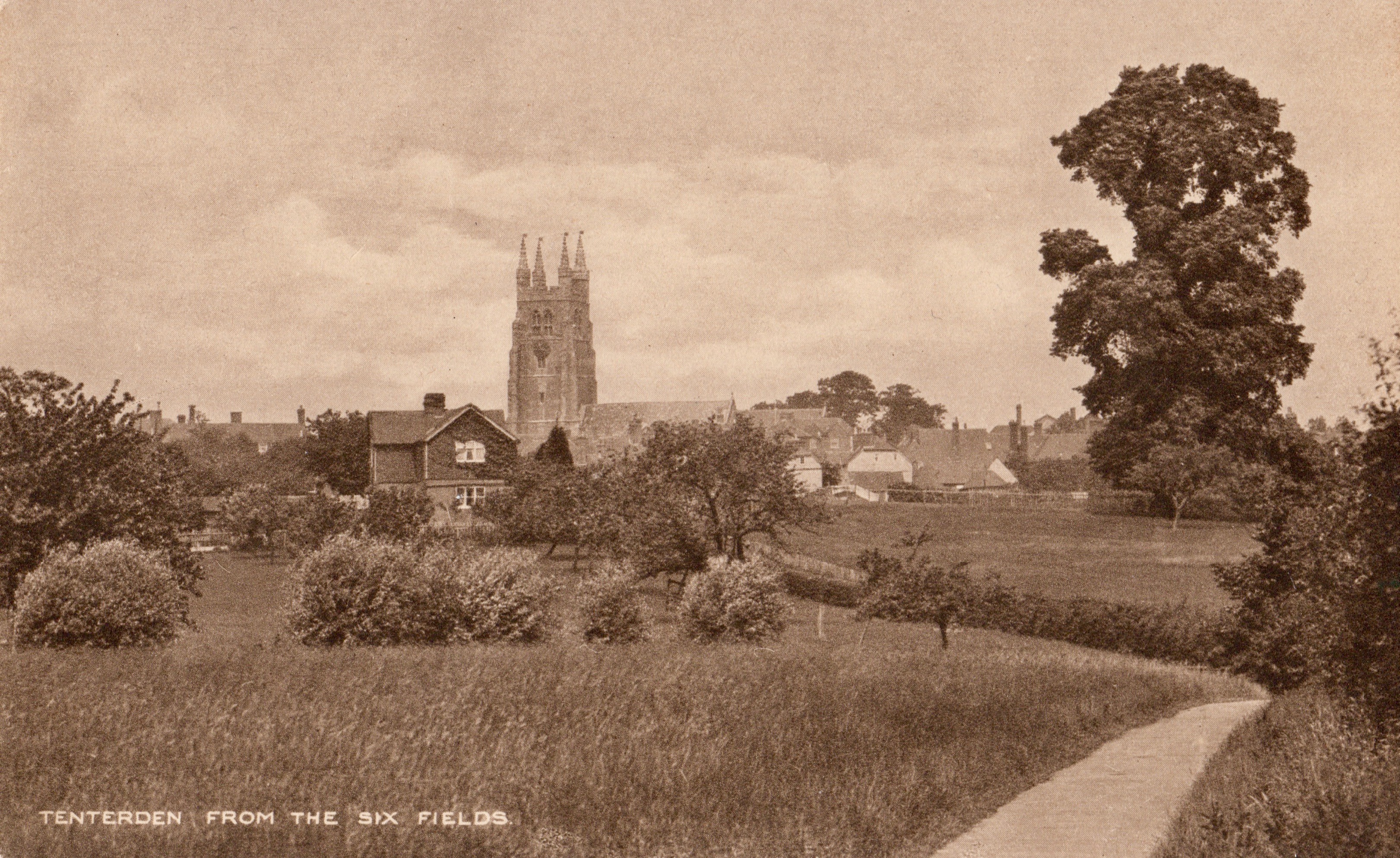 We made our way to the town of Tenterden and the spire of St Mildred’s Church could be seen from quite a distance, as seen in this old postcard looking north from Six Fields Lane.