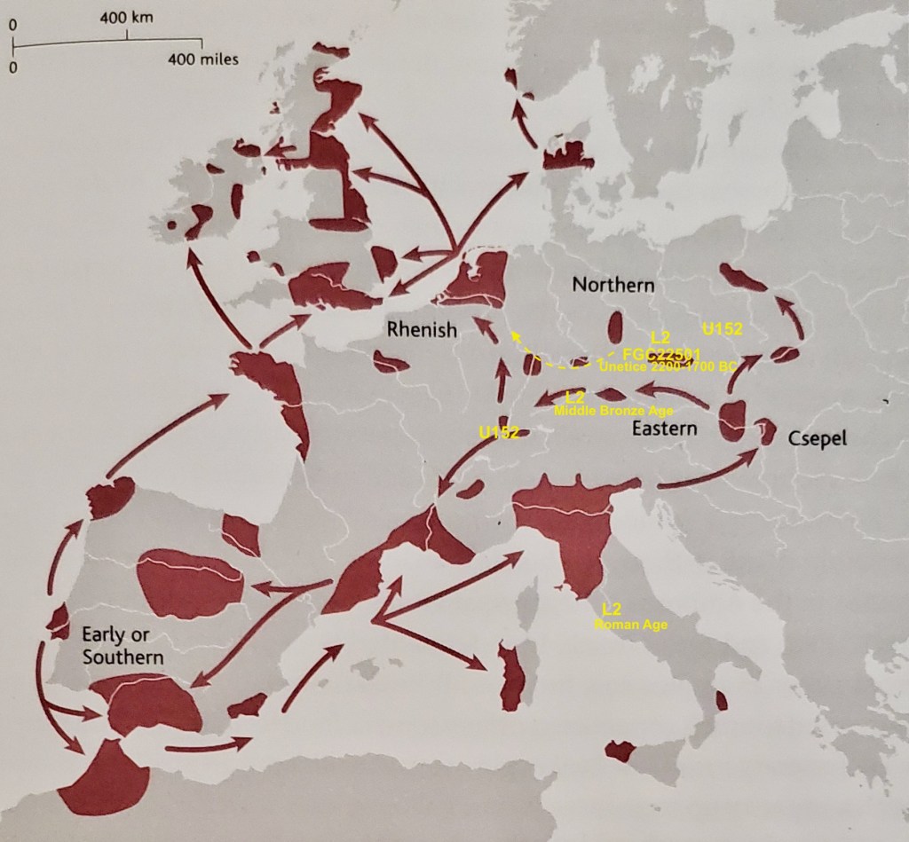 The YSNP U152 is believed to have arose from the Yamnaya coming out of the Eurasian Steppe about 5,000 years ago. L2 about 4700-4500 years ago part of the Early Bronze Age Bell Beaker Culture. Finally our SNP FGC22501 about 2300-1800 years ago in the Únětice culture in the area of the current Czech Republic.