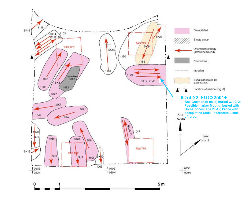 6Drif-22 was buried with 2 others in what is believed to have been a box grave (the wood having rotted, all that remained are nails), all had been decapitated. His grave mates were buried in alternating directions and face up. 6Drif-22 was buried prone (face down) with his decapitated head buried under his left torso. He was between 26-35 years old and about 5’9″ tall. Between the two sites excavated at Driffield Terrace 3 & 6 there were 72 individuals. At the Driffield 6 site all 20 were adult males. At the 3 Driffield Terrace site the ages ranged much more broadly. 6Drif-22 had “One potential penetrating injury…in the left half of the occipital bone … although the penetration may have resulted from a blunt-force injury. This individual had an irregular ‘L’ shaped lesion, part of which penetrated to the internal surface of the skull, where lamellar bone suggested healed inflammation.” He had a stabbing wound to his neck, dental carries and maxillary sinusitis and related abscess. His closest overall atDNA affinity using 1 population approximation:
