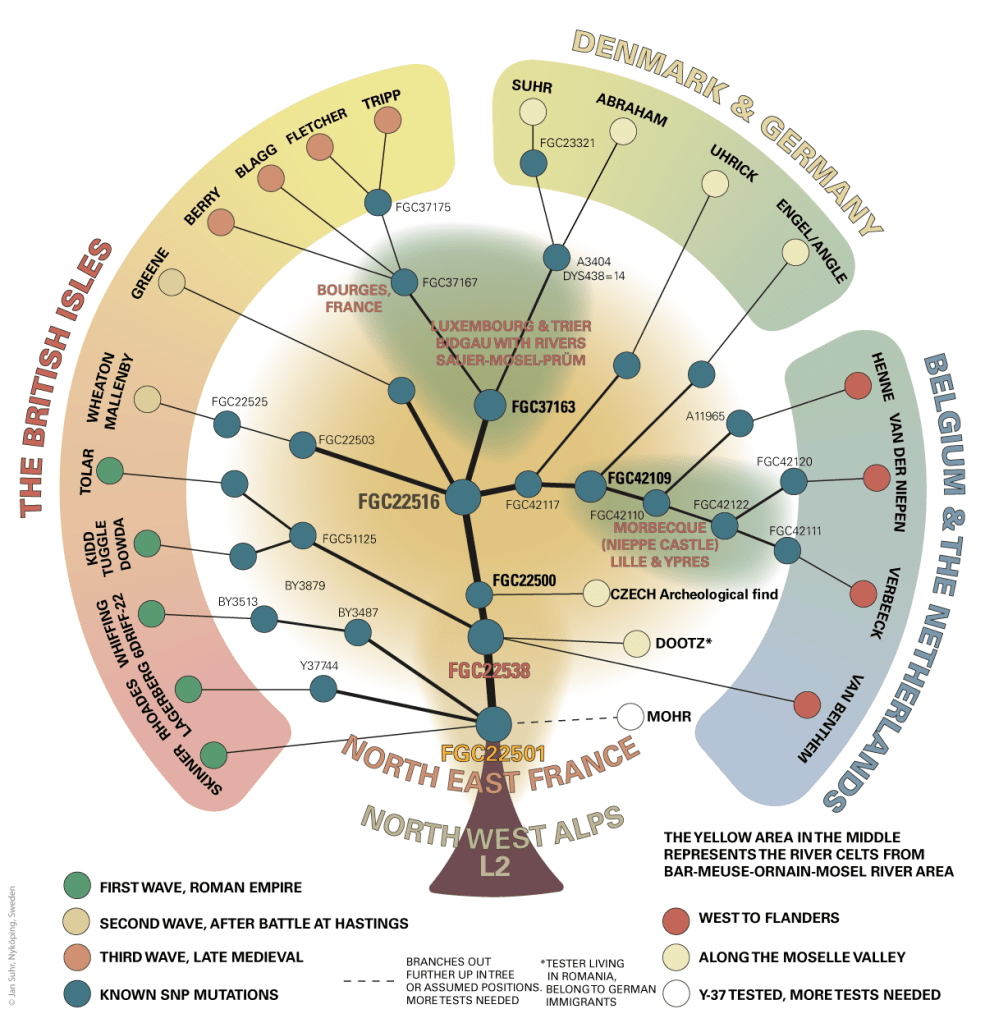 FGC22501 is a SNP below L2 that was first named by Full Genomes Corporation for a YDNA SNP found in my husband. Since that discovery we have found many men of many different surnames that carry this SNP as you can see in this graphic below. At FTDNA our U152> FGC22501: Celtic L2 FGC22501 and subclades project resides.