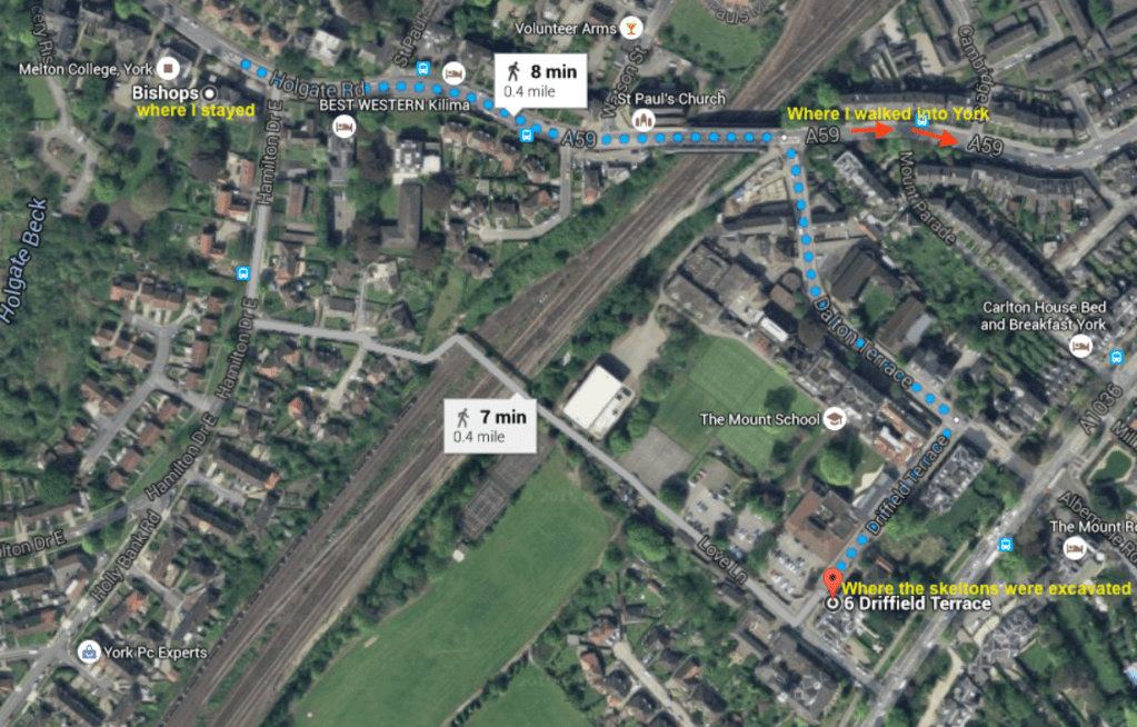 While staying in York I passed very close to the dig sie where the skeleton was unearthed. This annotated map from Google shows just how close I stayed to the dig site of 6 Driffield Terrace, walking within about .2 mile on my way into the walled city of York.