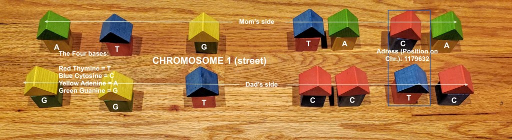 Think of your DNA as 22 streets with the names Chromosome 1, Chromosome 2 etc. Some of the streets are longer than others (Chromosome 1 has many more addresses than Chromosome 22). Each street has houses on both sides of the street and in our example each pair of houses facing each other have the same address (shown in the blue box as one address–in essence one nucleotide see Lesson 5). One side of the street represents the values you inherited from Mom and the other side is what you got from Dad. These are expressed as A, G, C or T that denote one of the 4 bases. We have many, many houses that are identical and we just skip over these addresses moving quickly down the street and we stop and take a closer look at the houses where there is variation (a SNP has occurred). Rather than test all these houses that are the same we leave them out and just test where there are SNPS.
