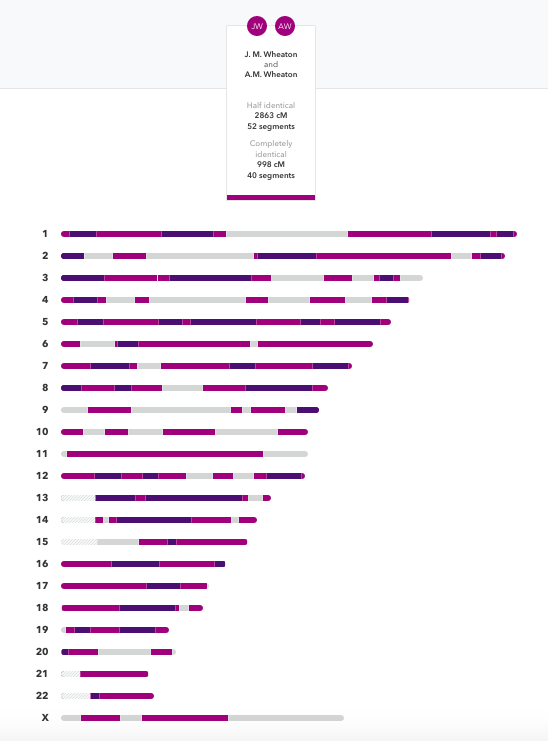 Below is a screenshot from 23andme comparing two of my children. The gray areas on the chromosome is where they each inherited a different segment from each of their parents. For example: A.M. Wheaton may have gotten my mother’s segment from me (maternal grandmother) and J. Wheaton my father’s segment (maternal grandfather). Remember each pair of houses represent SNPS from mom and dad. From their dad A.M. Wheaton got his dad’s dad segment (paternal grandfather) and J. Wheaton from his dad’s mother’s segment (paternal grandmother). So in these gray stretches all 4 grandparents are represented because each child’s two sides do not match the other child’s two sides! In the light purple segments one half of the DNA is the same, so they each may have inherited perhaps my mother’s segment (maternal grandmother) but received different segments from their dad’s parent’s (one inherited the paternal grandmother and the other the paternal grandfather). And finally the dark purple segments show where they got exactly the same segments from both parents. So perhaps my dad’s segment from me (maternal grandfather) and their dad’s dad from him (paternal grandfather).