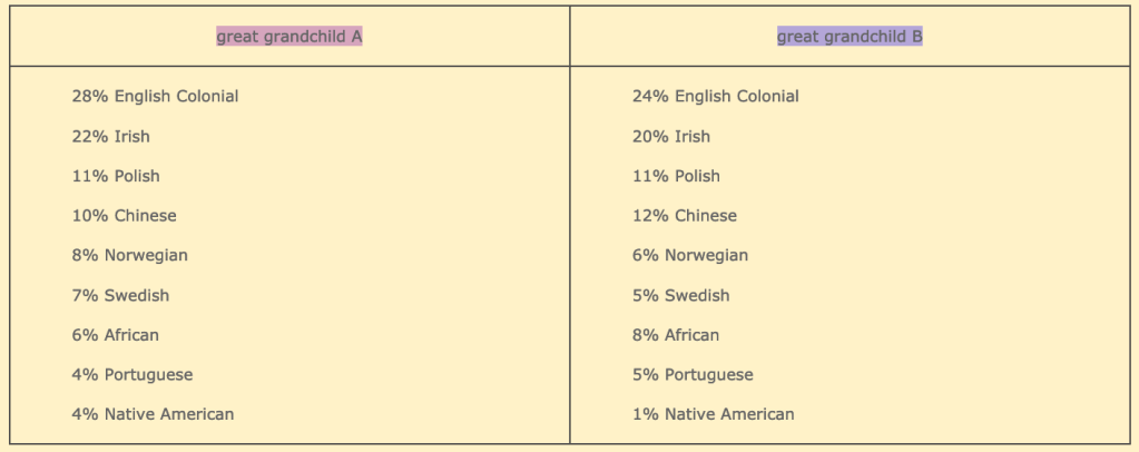 However the DNA we inherit from each great grandparent is not equal and those great grandparents with more than one ancestry may give unequal shares of that ancestry to their children and then their children give more or less to their children and so forth. So in the DNA lottery you may have gotten 13% from your Chinese (salmon) great grandma but your half Native American and half Portuguese (lt blue) great grandpa may have only given you 12% of his DNA and not in equal portions so you may have only retained 3% of the Native American and the other 9% is Portuguese. This does not change who are great grandparents are. Our DNA only reflects what we win from each great grandparent in the DNA lottery. So in reality great grandchildren with the same parents might look like this: