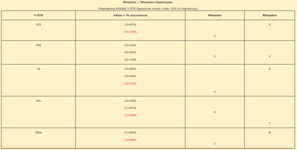 The chart below shows the first five Y-STR values that comprise the “signature” for Wheaton Group B and Wheadon Group C.
